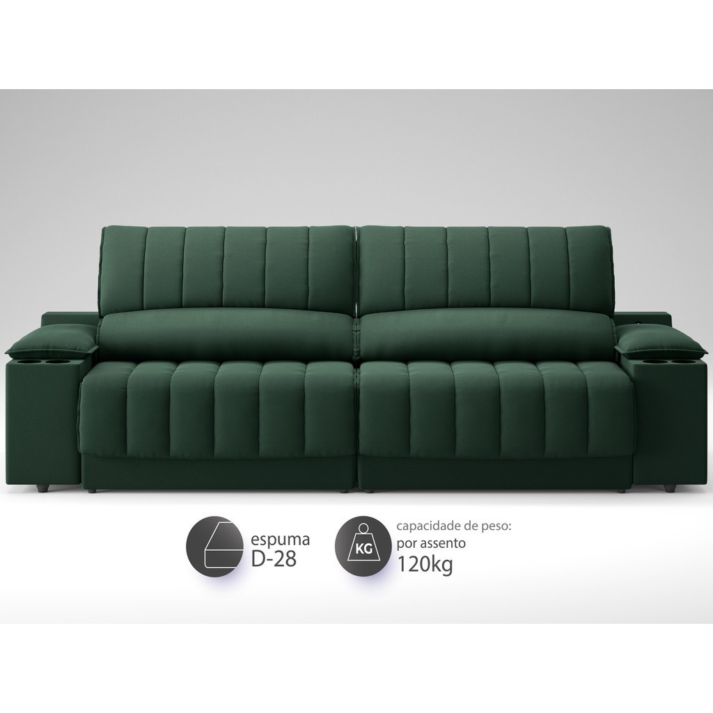 Sofá com Porta Copos Carregador USB Ret Rec Murano 2,00m Velosuede Verde - NETSOFAS