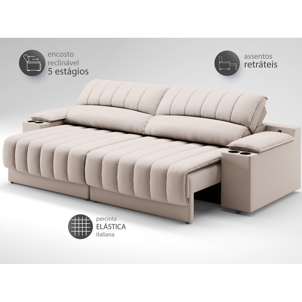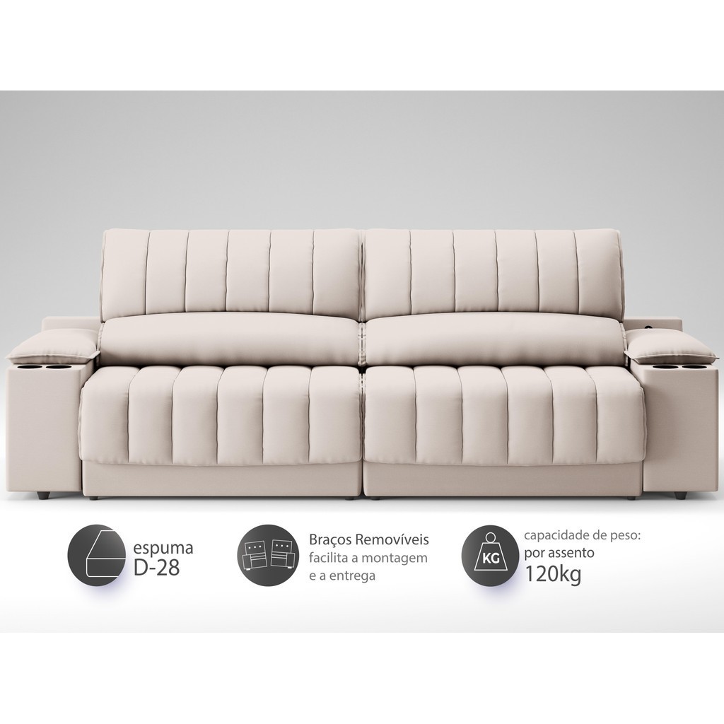 Sofá com Porta Copos Carregador USB Ret Rec Murano 2,30m Velosuede Areia - NETSOFAS