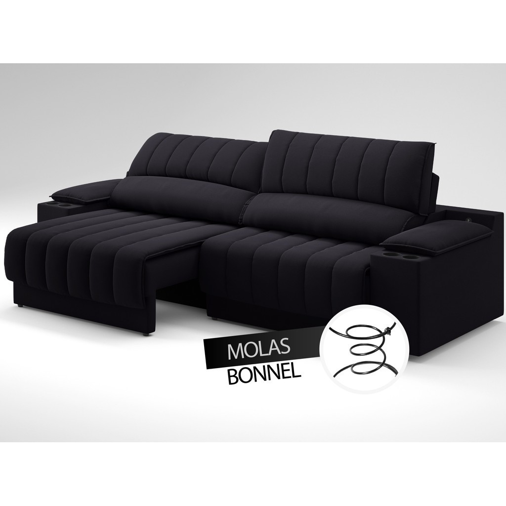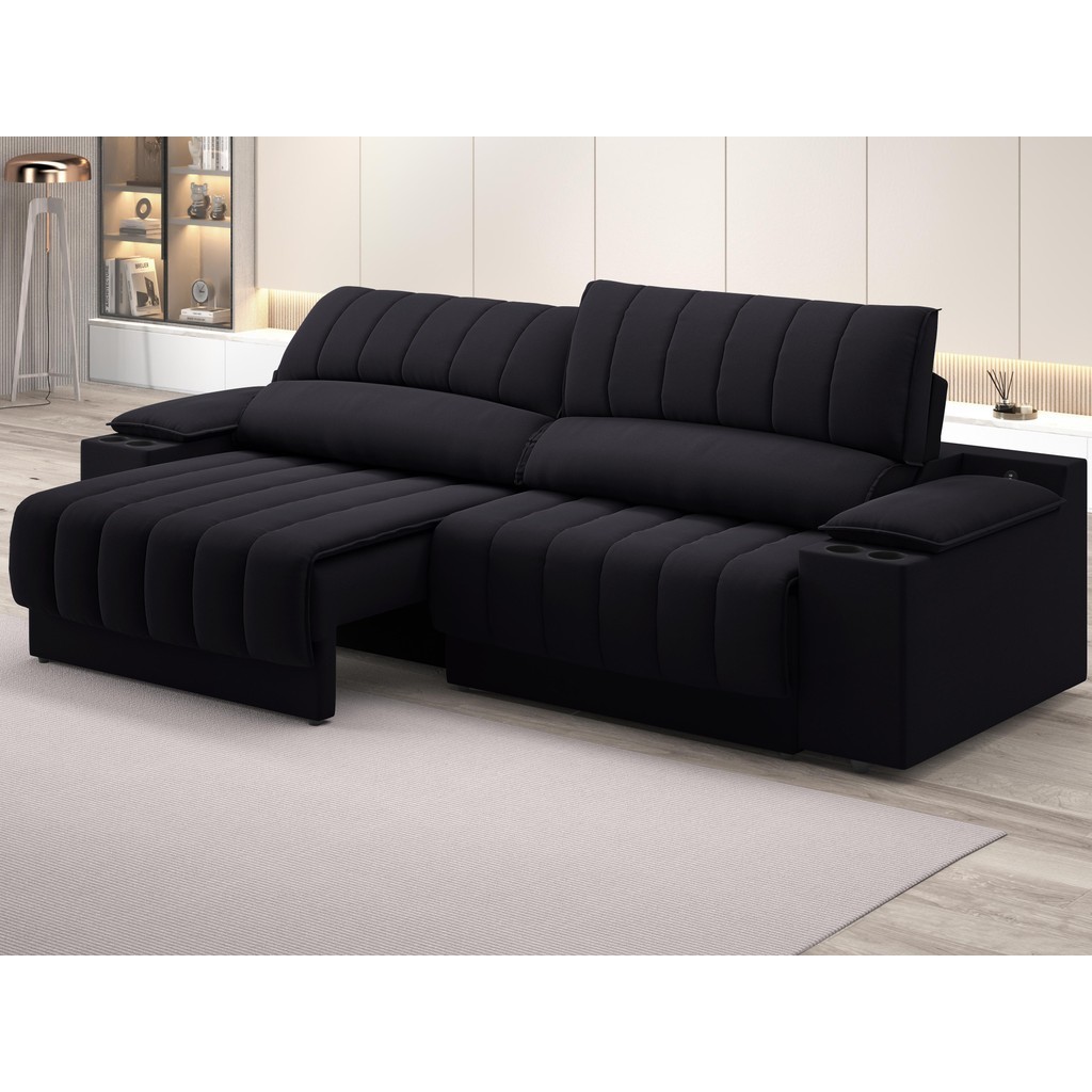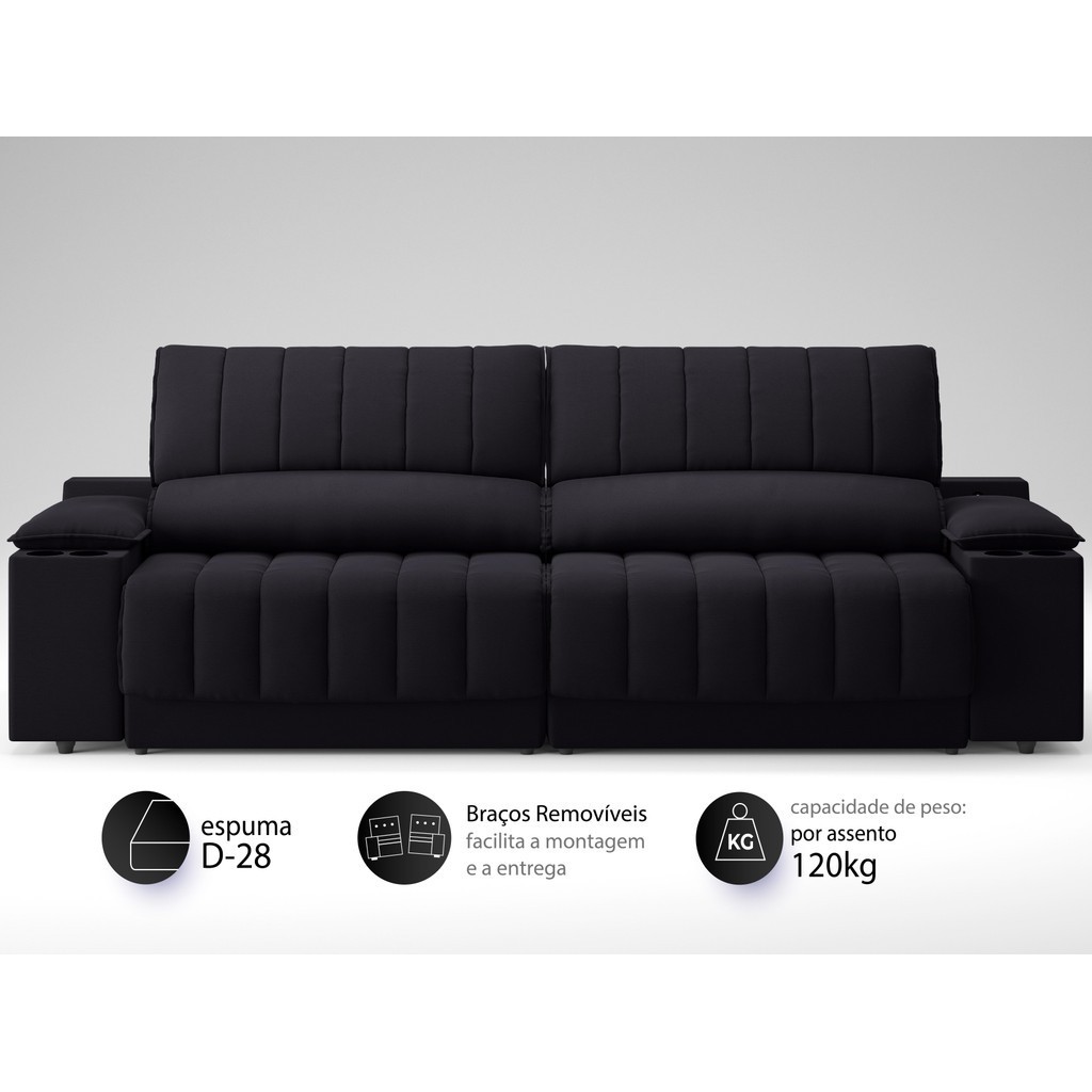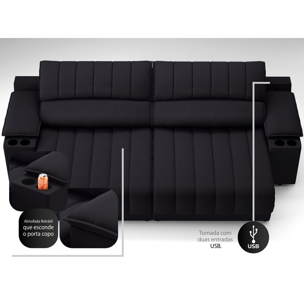 Sofá com Porta Copos Carregador USB Ret Rec Murano 2,30m Velosuede Preto - NETSOFAS