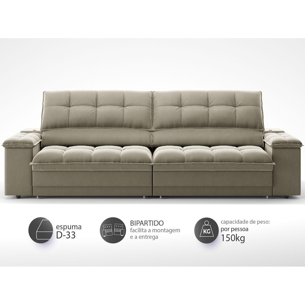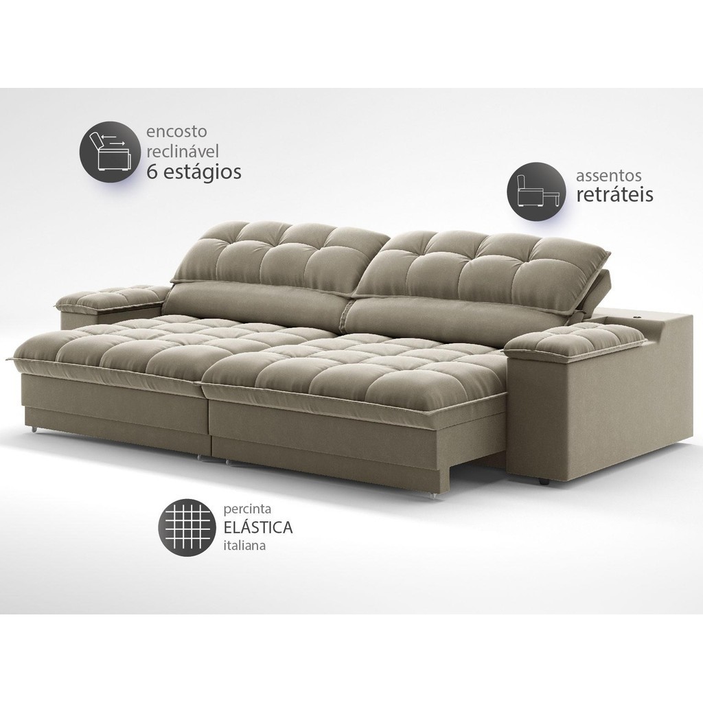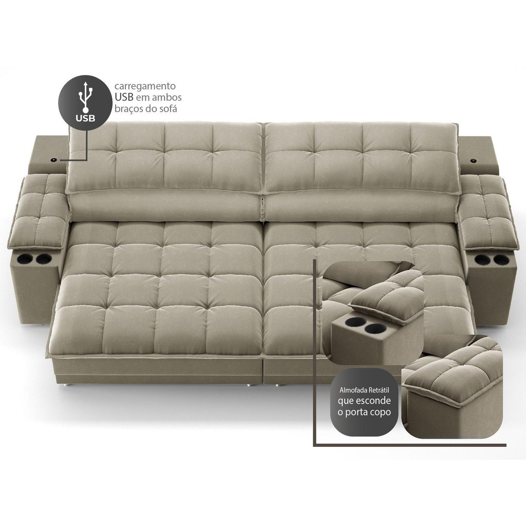 Sofá com Porta Copos e Carregador USB Ret Rec Luke 2,10m Veludocristal Fendi - NETSOFAS