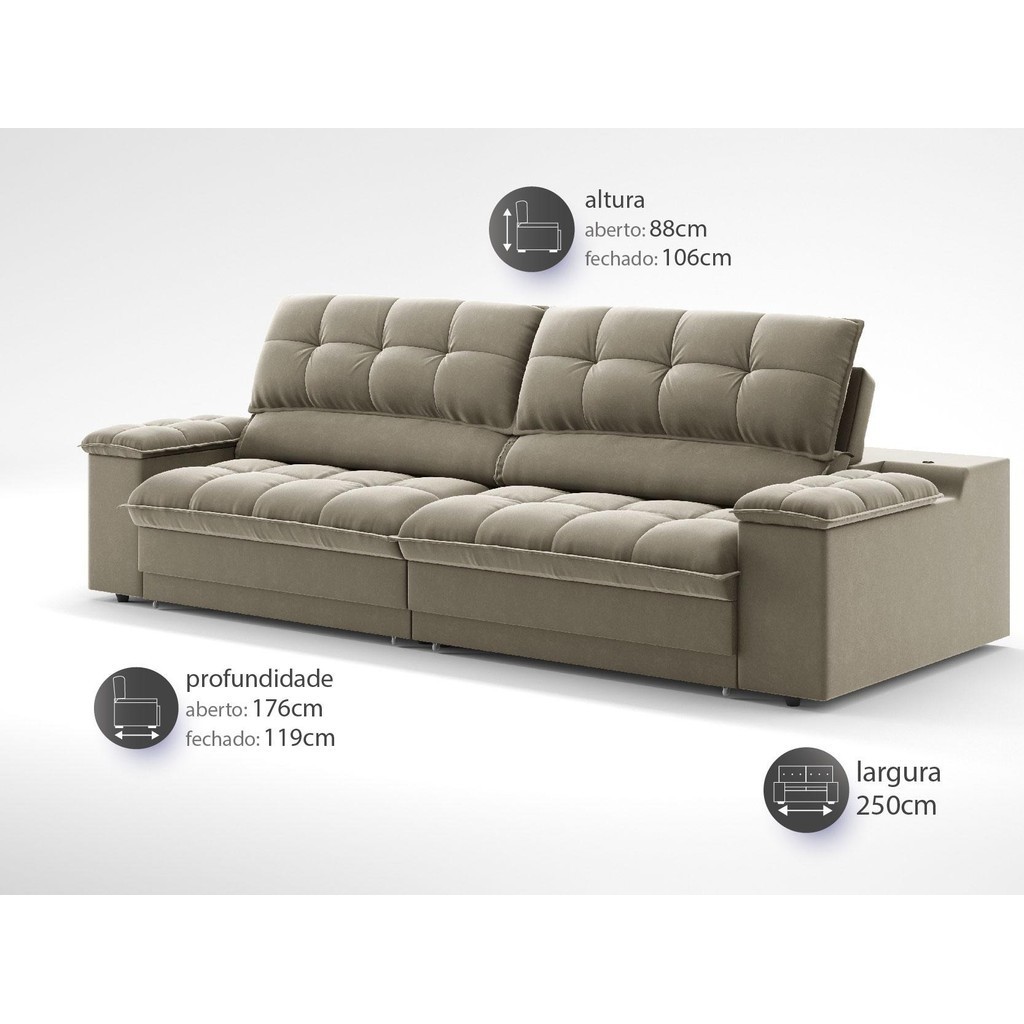 Sofá com Porta Copos e Carregador USB Ret Rec Luke 2,50m Veludocristal Fendi - NETSOFAS