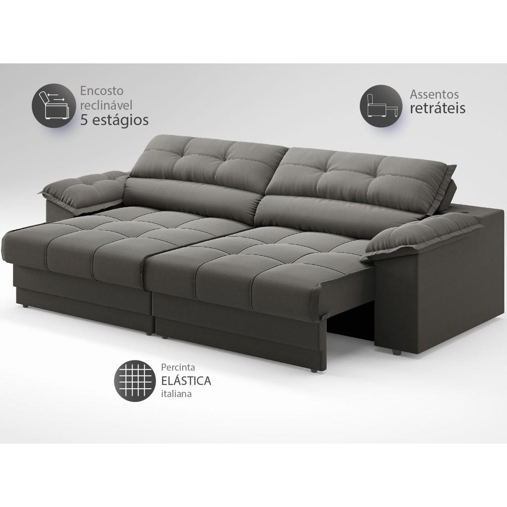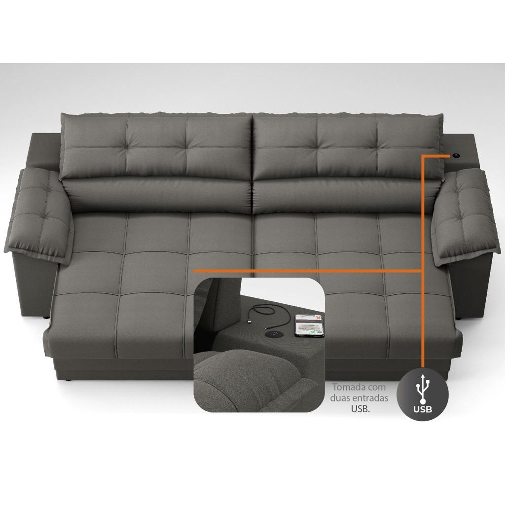 Sofá com Carregador USB Retrátil Reclinável Mimo 2,30m Velosuede Cinza - NETSOFAS