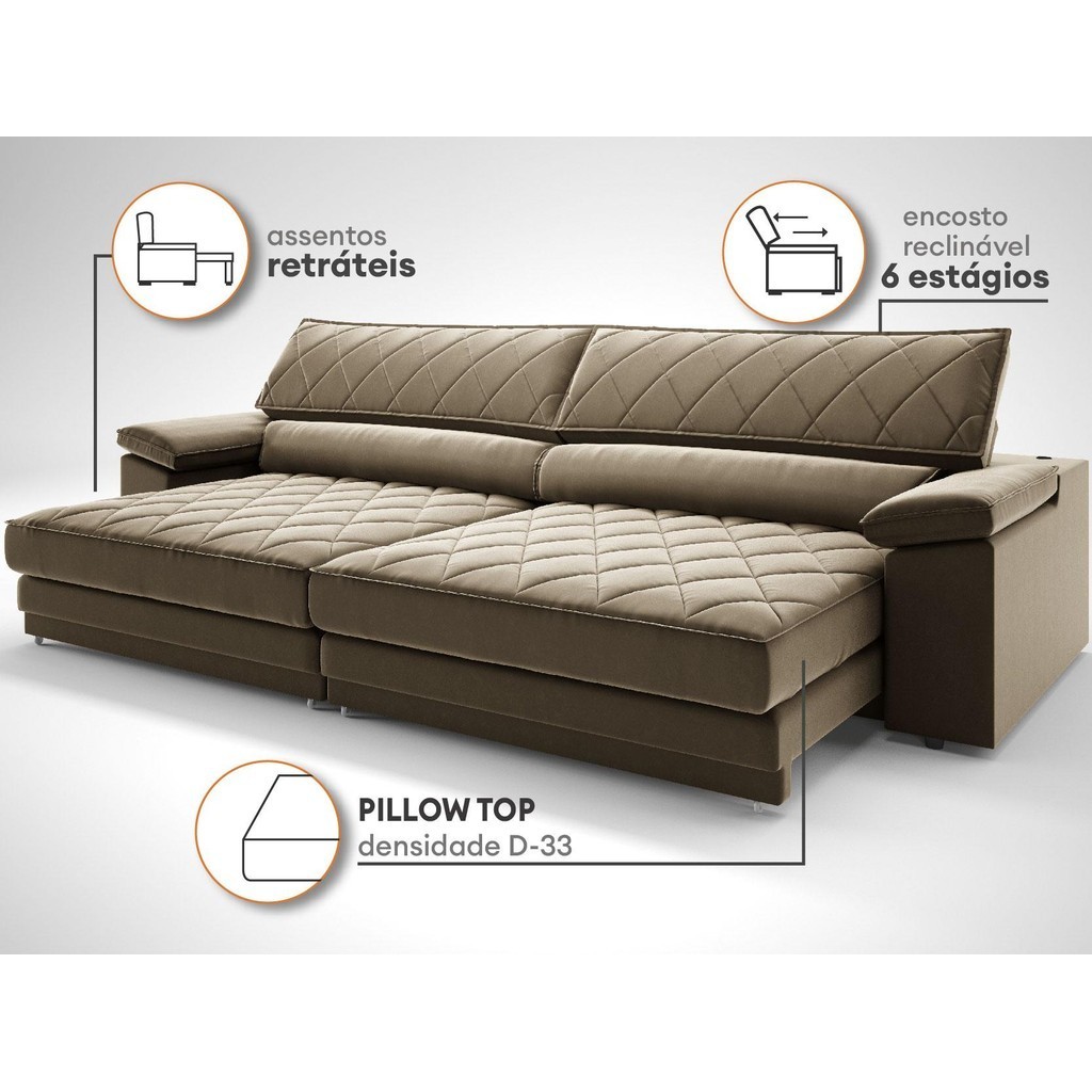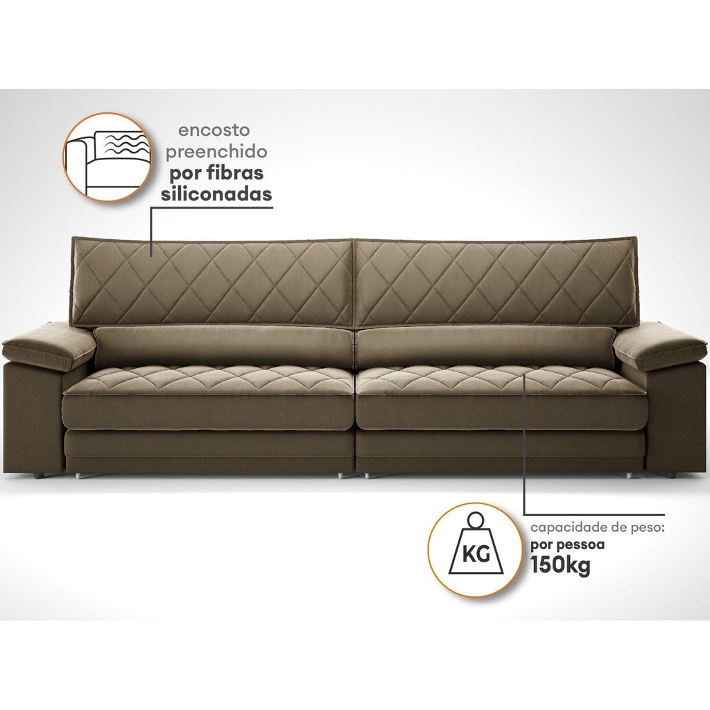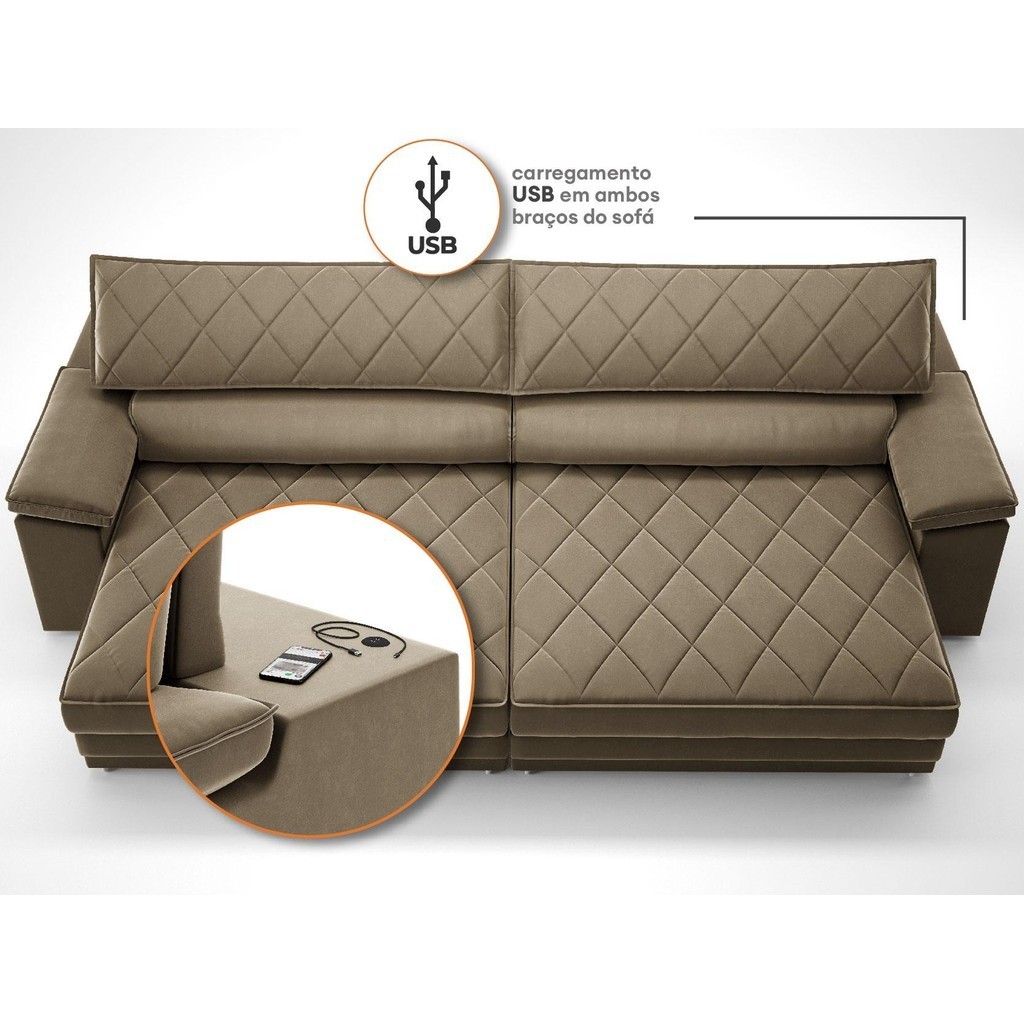 Sofá de Duplo Molejo com Carregador USB, Retrátil e Reclinável Viena 2,50m Veludocristal Castor- NETSOFAS