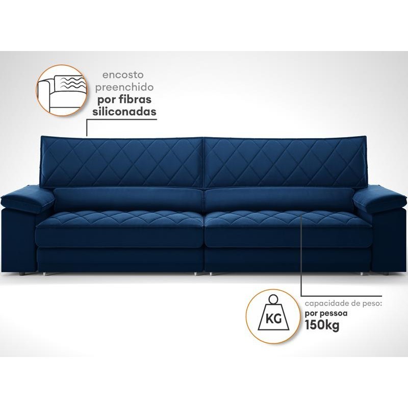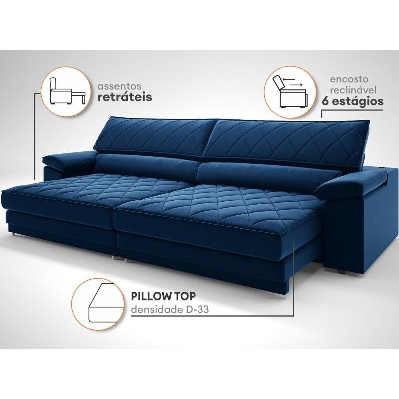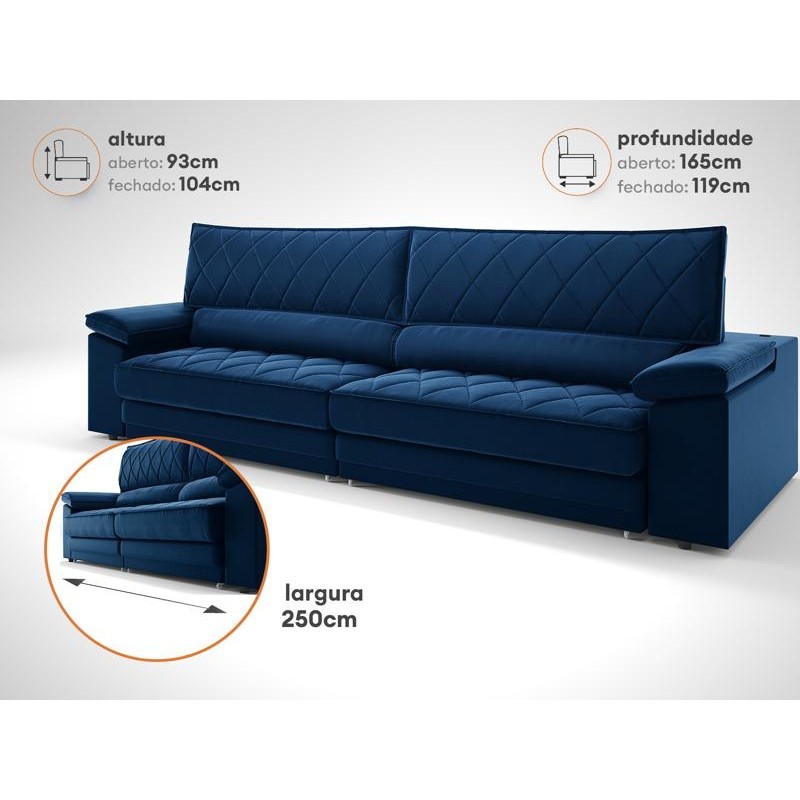Sofá de Duplo Molejo com Carregador USB, Retrátil e Reclinável Valencia 2,50m Veludocristal Azul Marinho- NETSOFAS