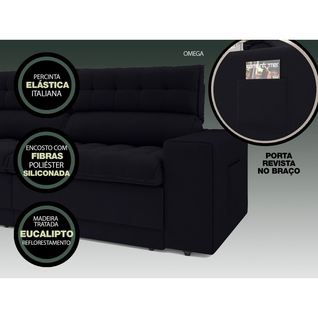 Sofá Omega 2,00m Assento Retrátil e Reclinável Velosuede Preto - NETSOFAS