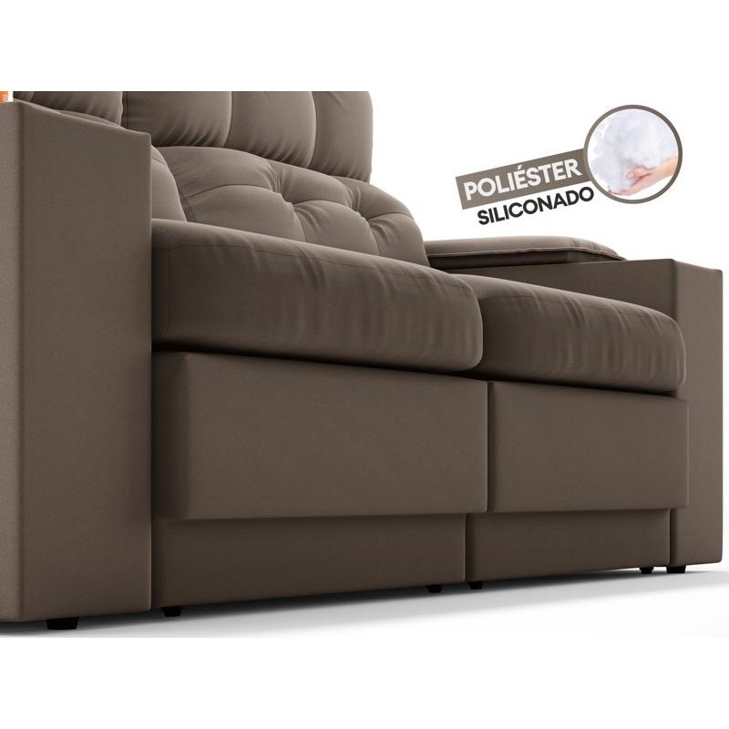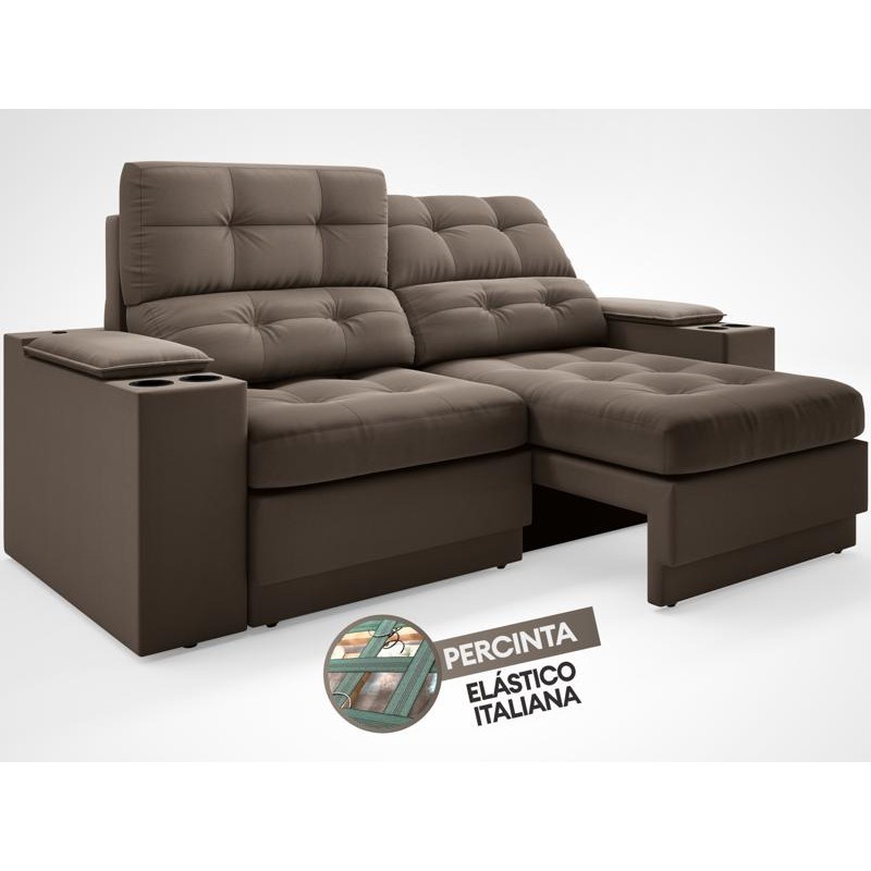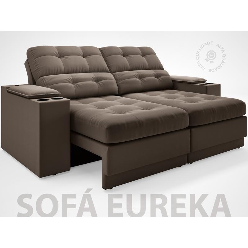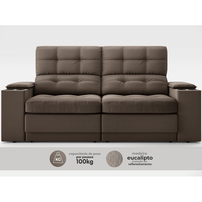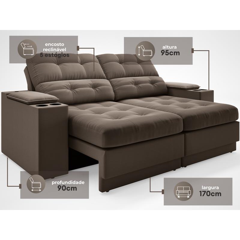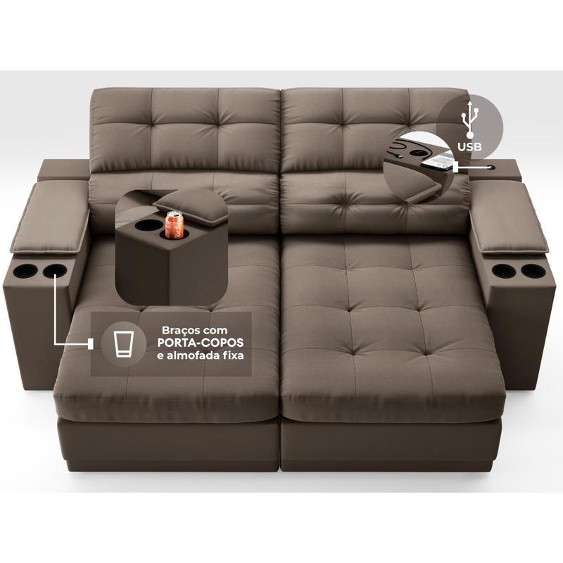 Sofá com Porta Copos e Carregador USB Eureka 1,70m Assento Retrátil e Reclinável Velosuede Marrom - NETSOFAS