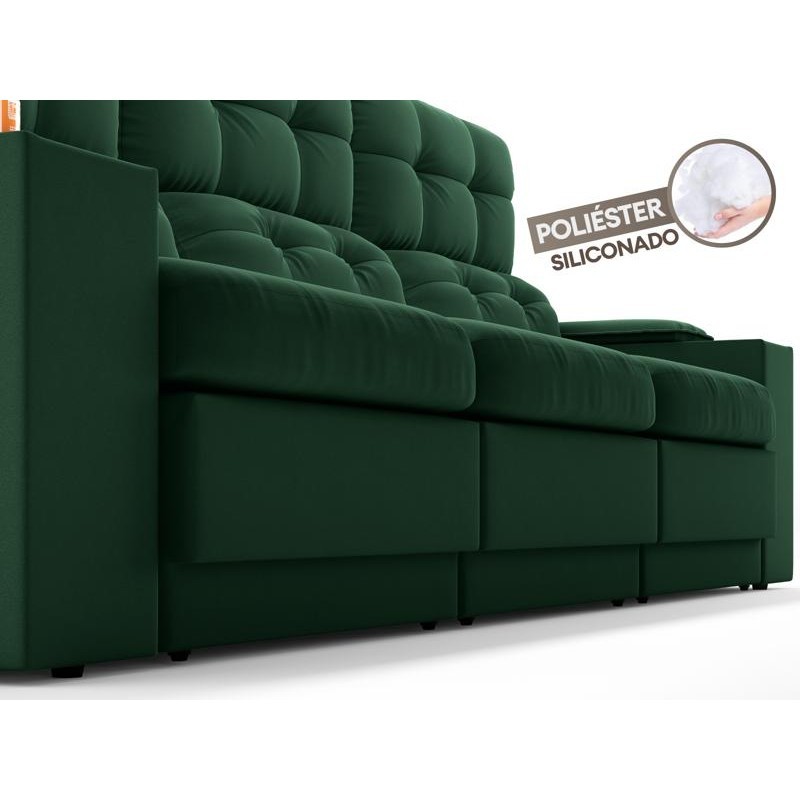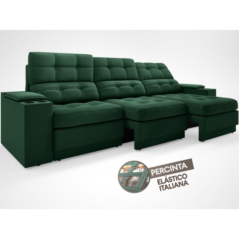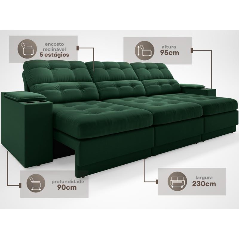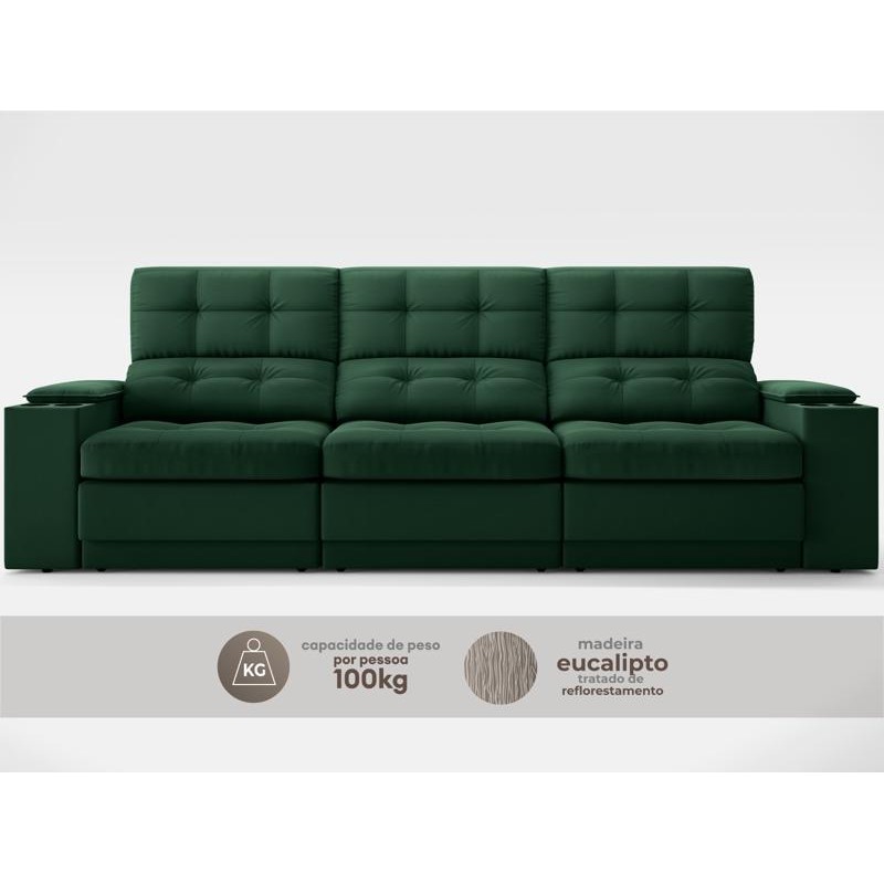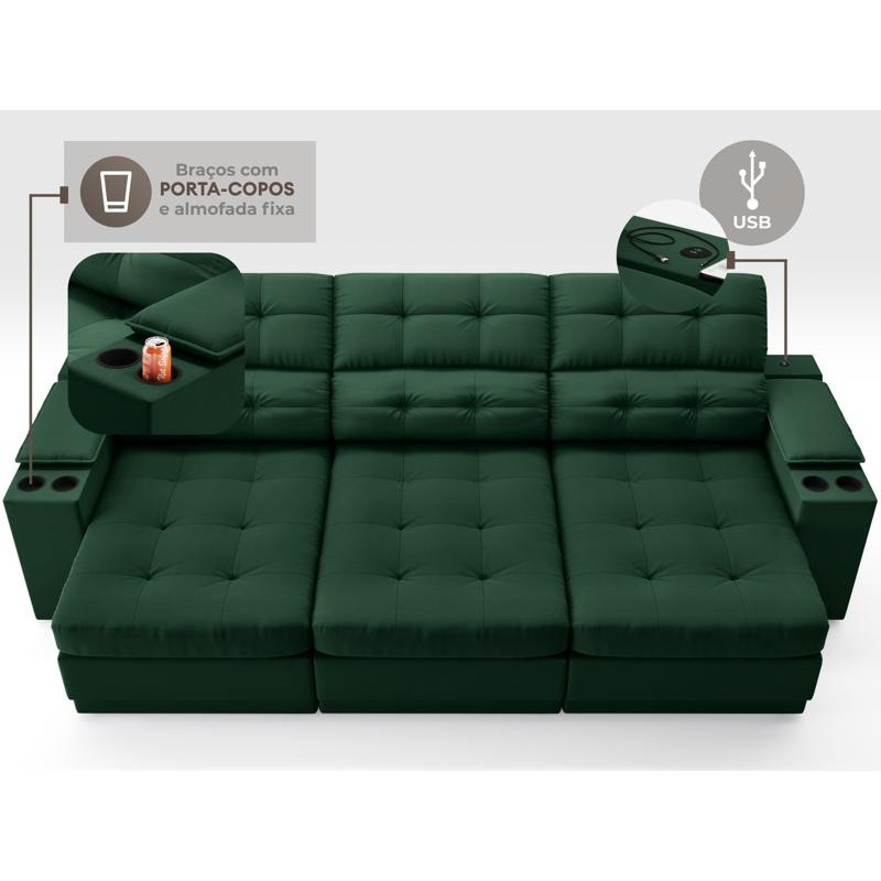 Sofá com Porta Copos e Carregador USB Eureka 2,30m Assento Retrátil e Reclinável Velosuede Verde - NETSOFAS