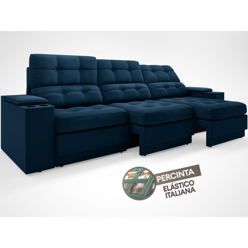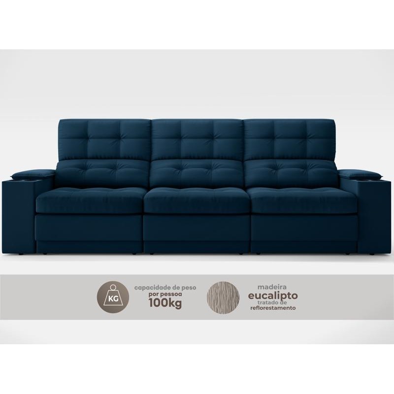 Sofá com Porta Copos e Carregador USB Eureka 2,30m Assento Retrátil e Reclinável Velosuede Petróleo - NETSOFAS