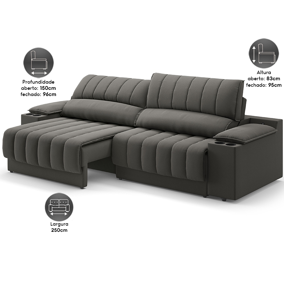 Sofá com Porta Copos Carregador USB Ret Rec Murano 2,50m Velosuede - NETSOFAS