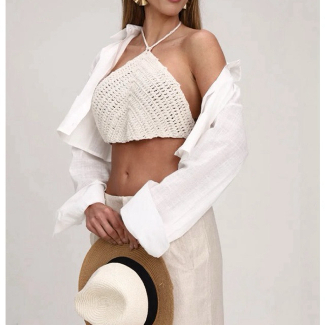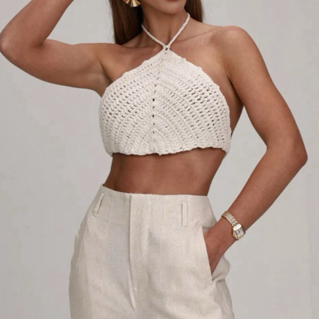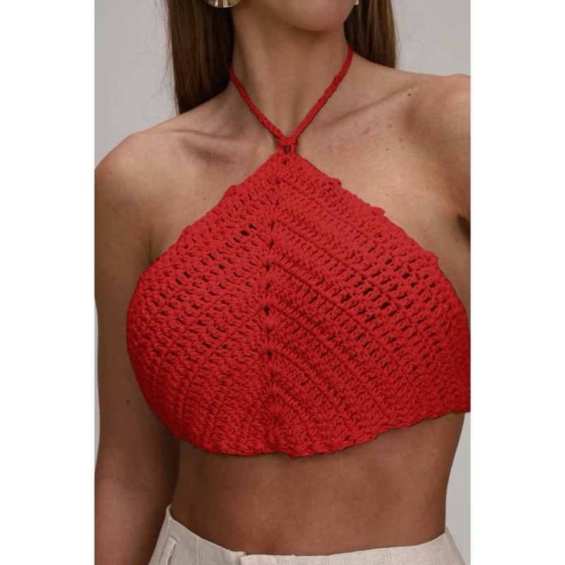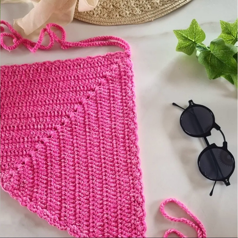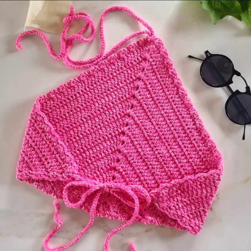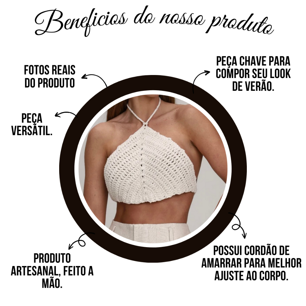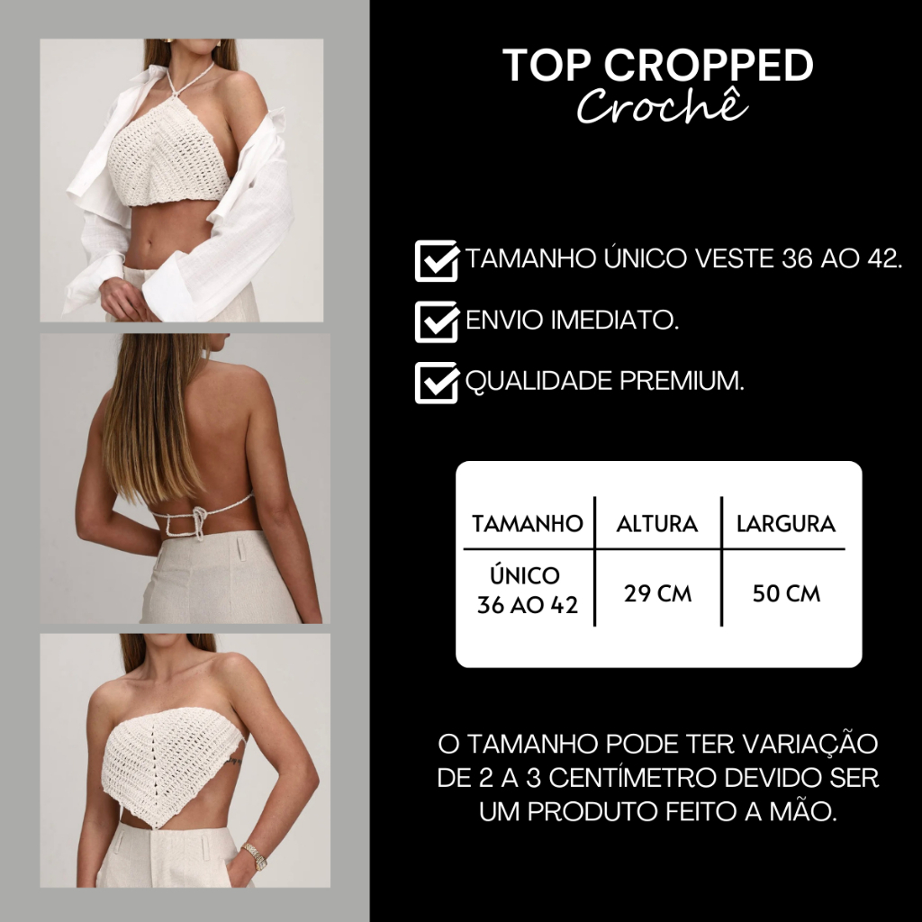 Top Cropped de Crochê Feminino Modelo Triangular com Amarração Costas Nua