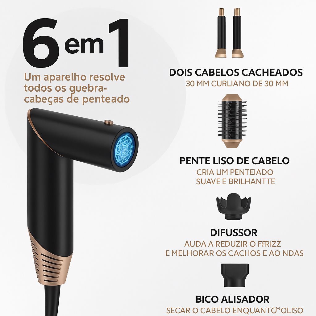 Escova Secadora 6 em 1 Dobrável Automática Cabelo Liso e Cacheado 110V-220V