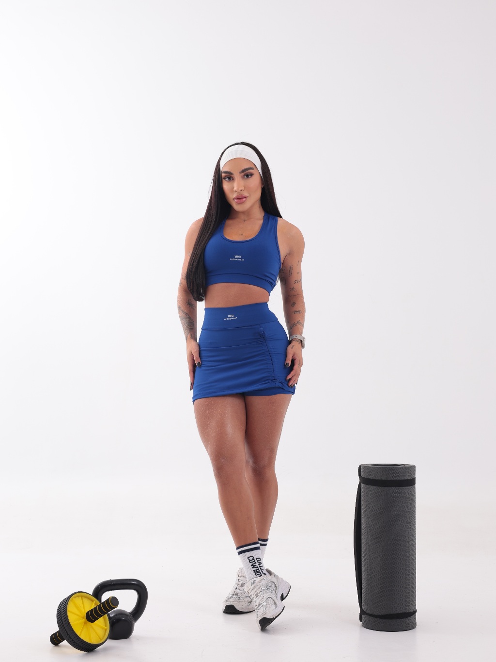 Conjunto Academia Azul Royal Short Saia e Top Fitness Ajusta No Corpo Cintura Alta