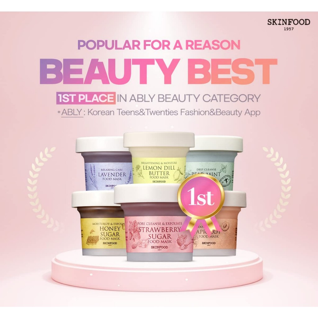 SKINFOOD Máscara de comida (7 tipos) Mint de pera / açúcar de morango / damasco / açúcar de mel / lavanda / batata |, Lave máscaras faciais, 120g