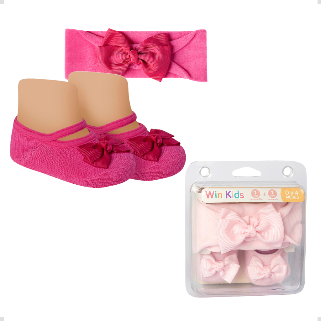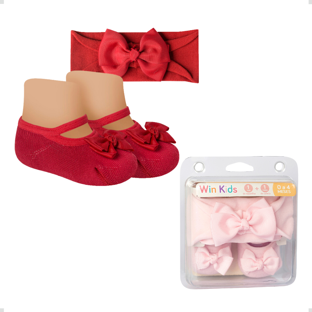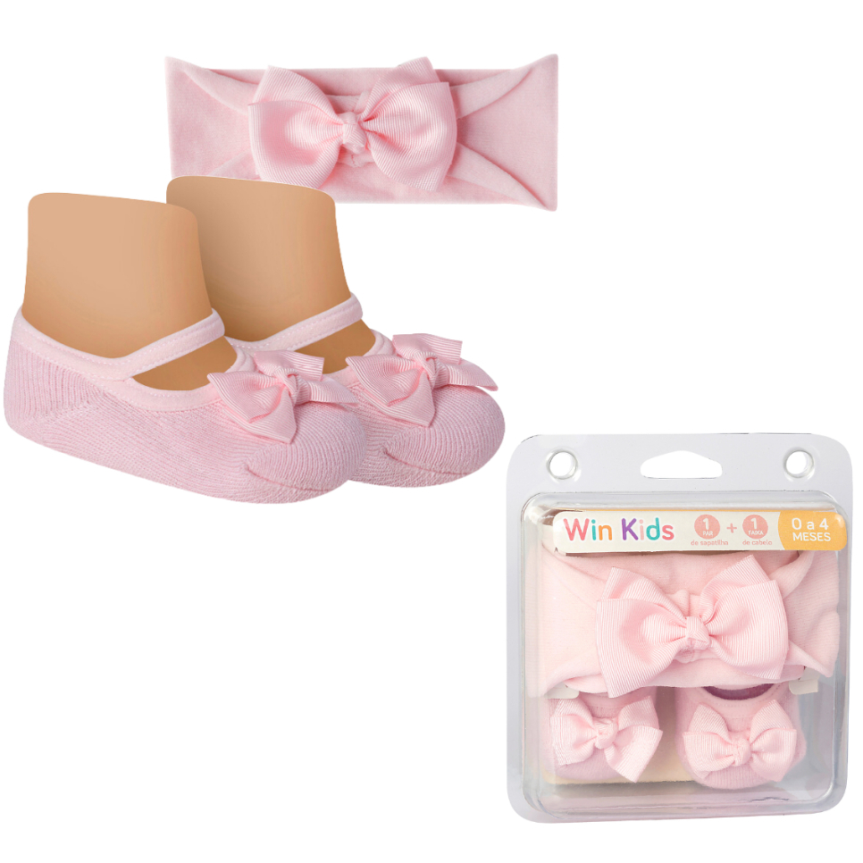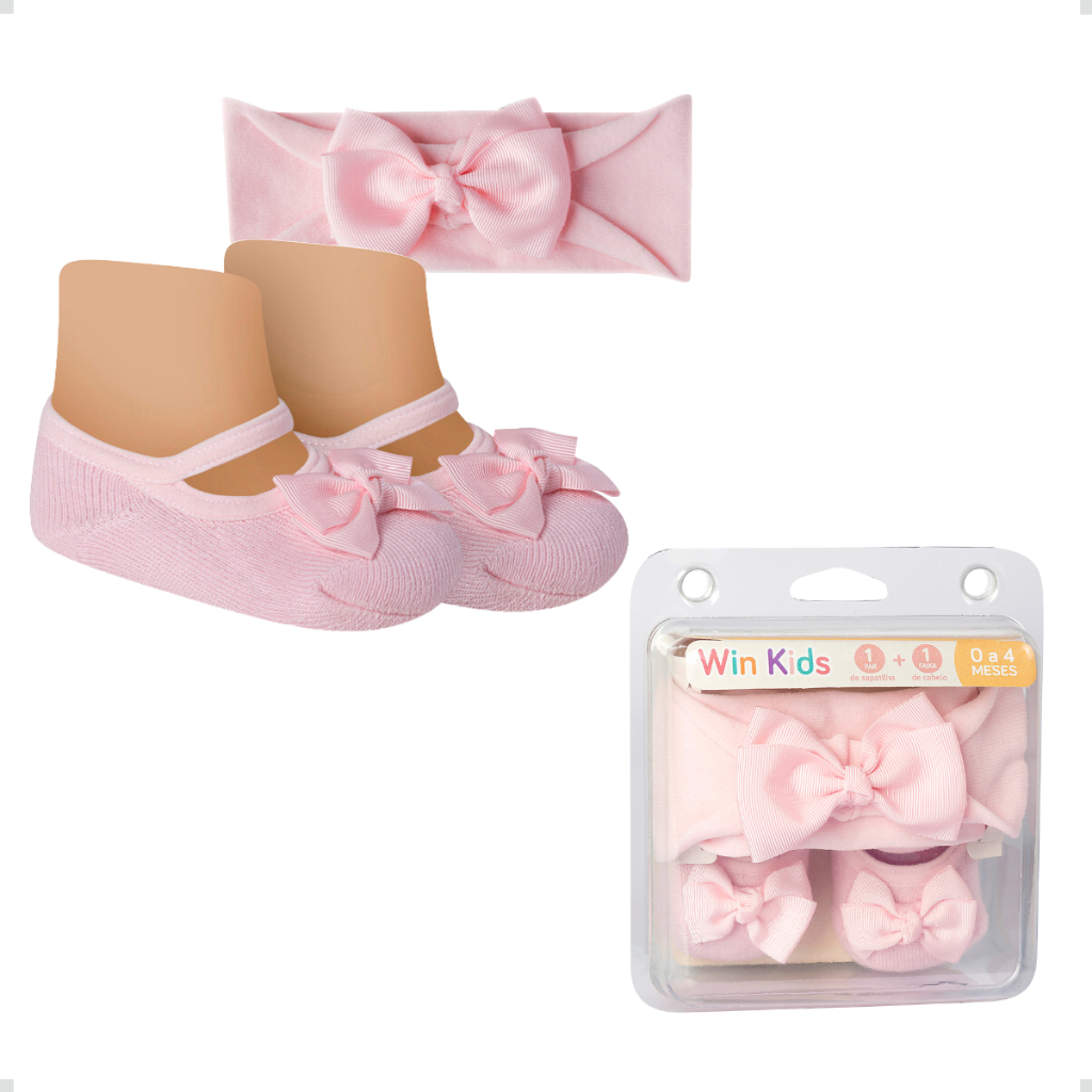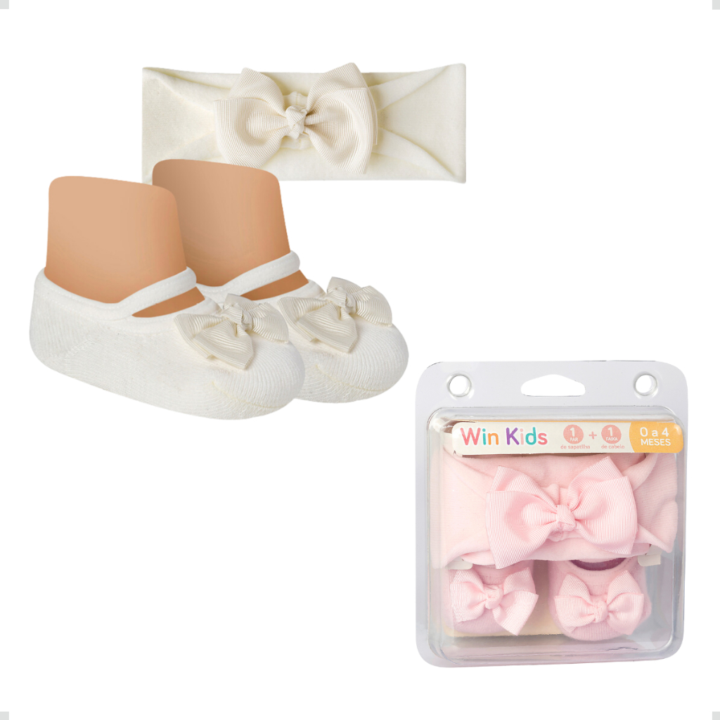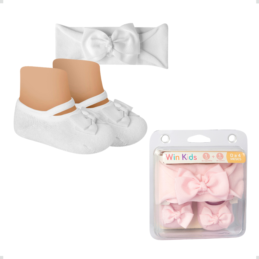 Kit Meia Sapatilha Algodão e Faixa de Cabelo Com Laço Bebê Recém Nascido Presente Menina Infantil Rn