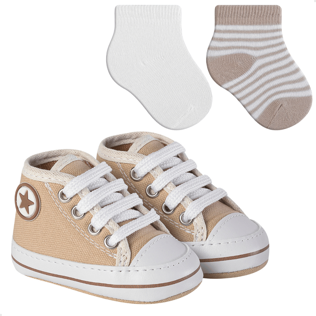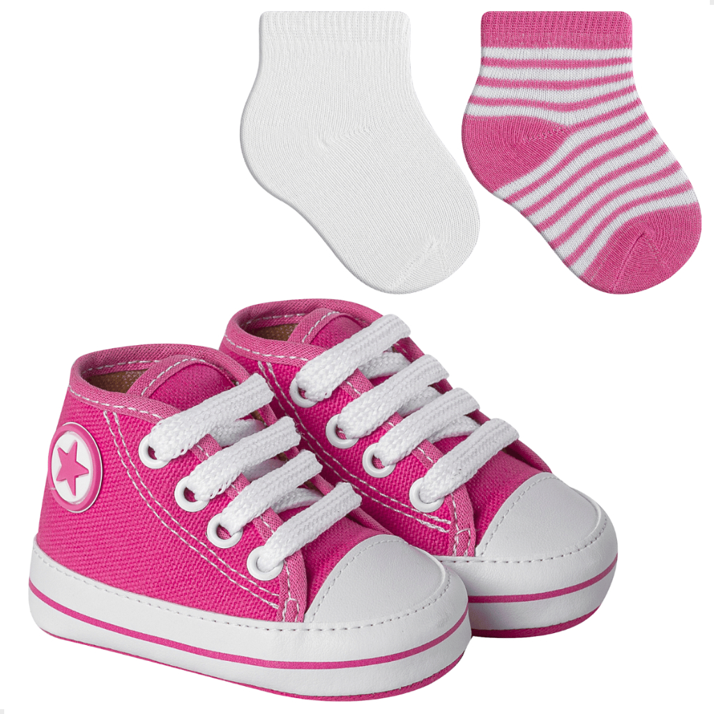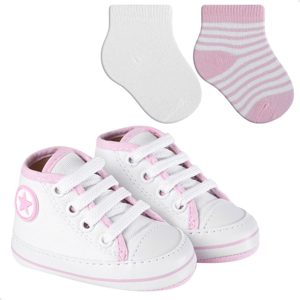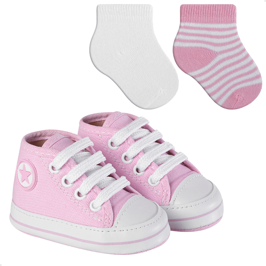 Kit Presente 1 Par de Tênis Sapatinho e 2 Pares de Meias Bebê Recém Nascido Rn Menina Menino Enxoval