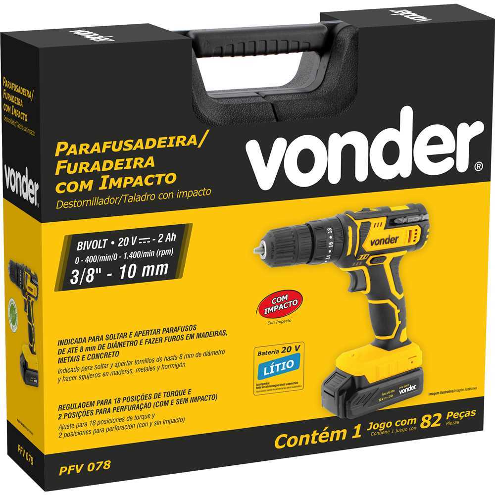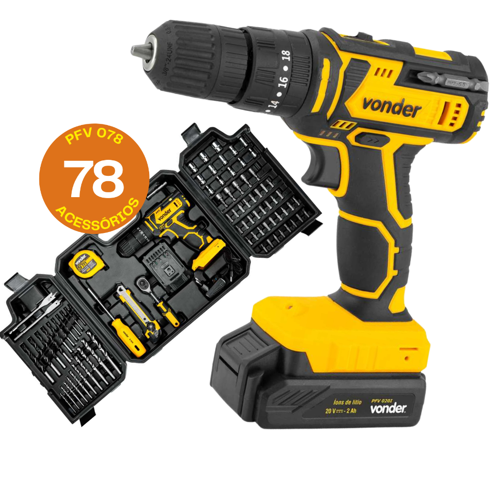 Parafusadeira Furadeira de Impacto A bateria 20V 78 Peças Bivolt Automatico Vonder