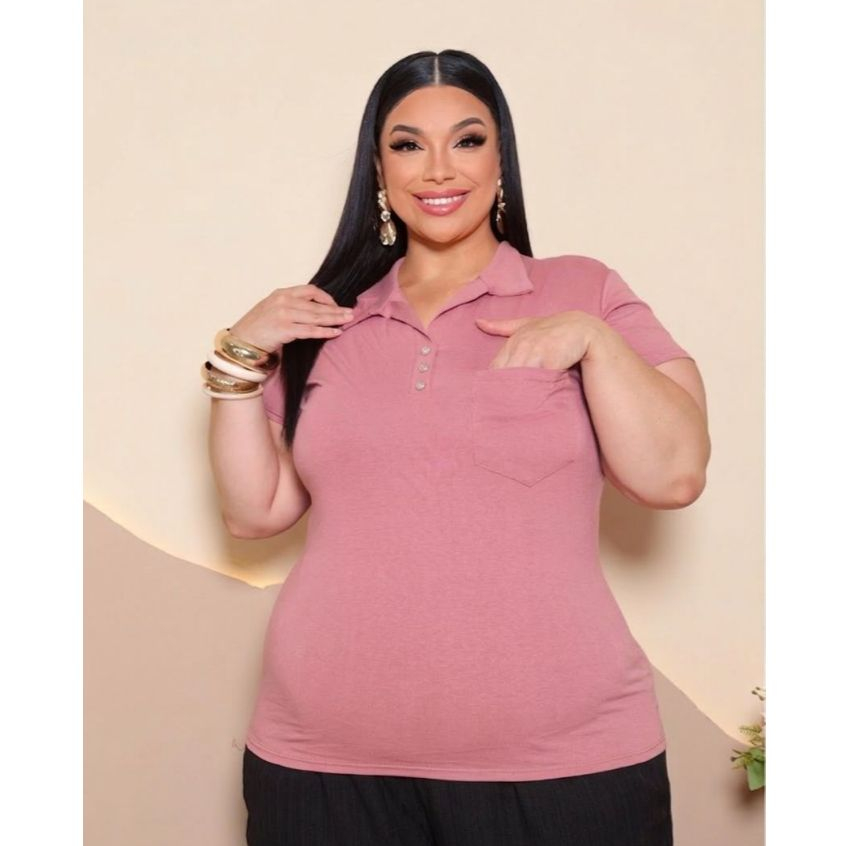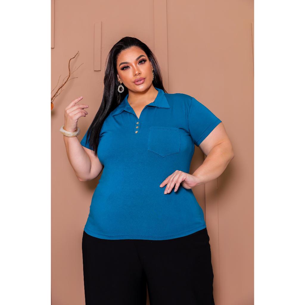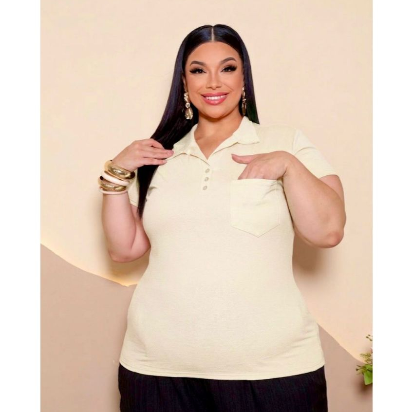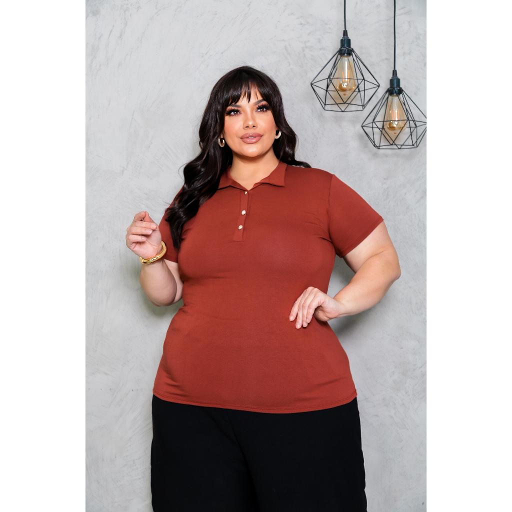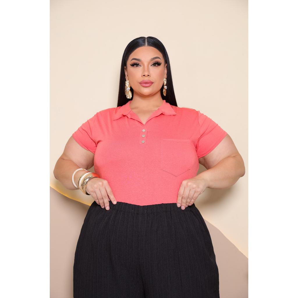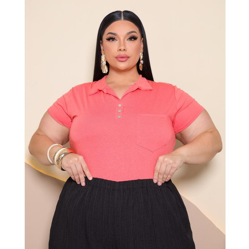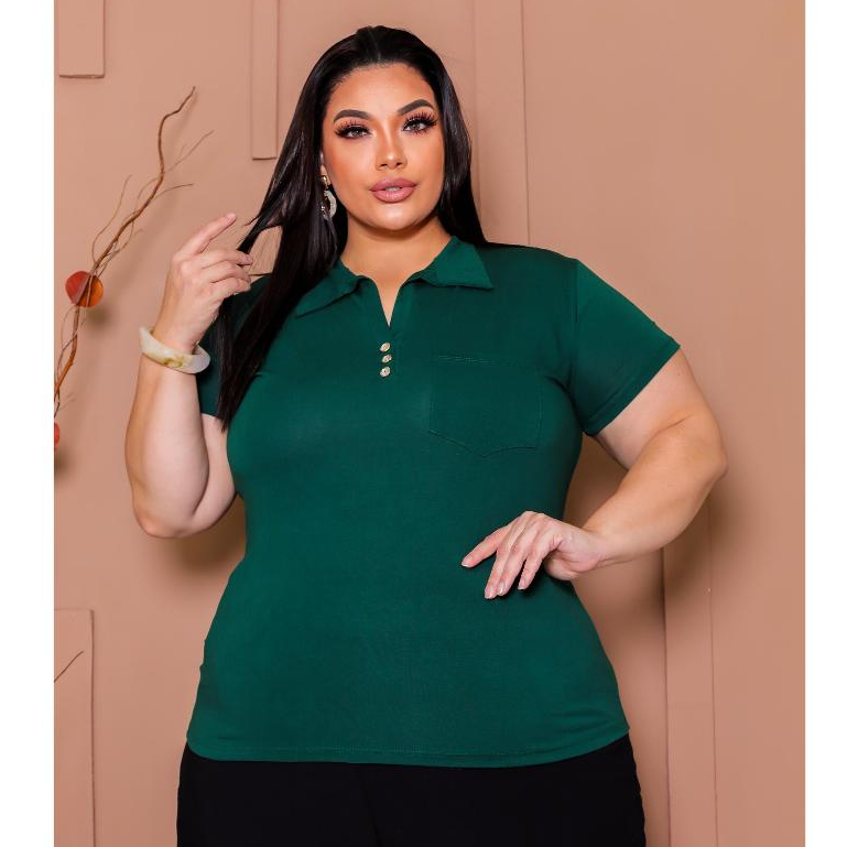 Blusa Plus Size Feminina Manga Curta com Gola Colarinho Polo Botão Regulável Plus Size