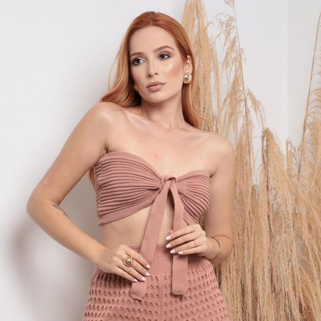 Conjunto Feminino Tricot Ponto Croche Top Amarração E Calça Com Forro Trico Moda Verão Praia