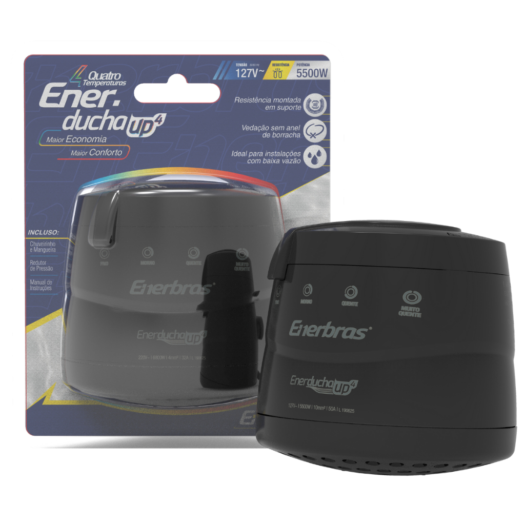 Chuveiro Ducha Preto Enerducha Up 4 Temperaturas - Enerbras Eletrico Economico Pequeno Banheiro Parede Black Preta Compativel com IDR 4T 5500W 4500W 6800W 110V 127V 220V