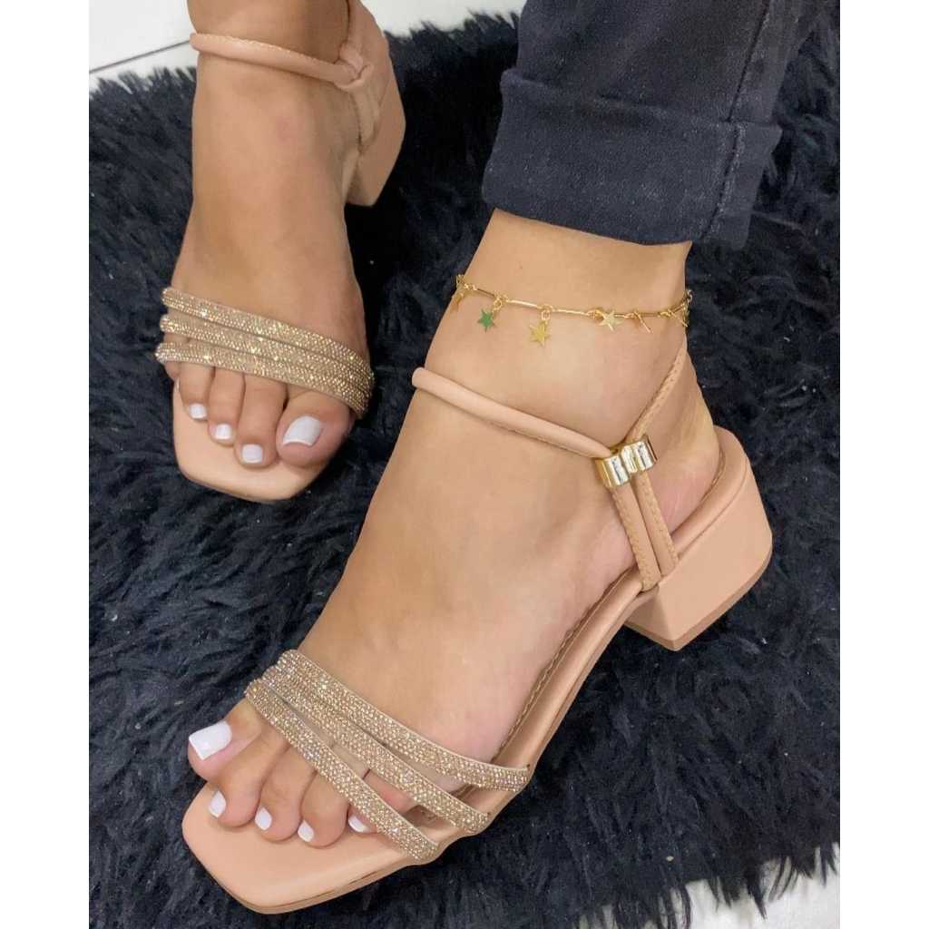 Sandalia Feminina Salto Bloco Tira Strass E Tira Baulada 2 Modos De Uso
