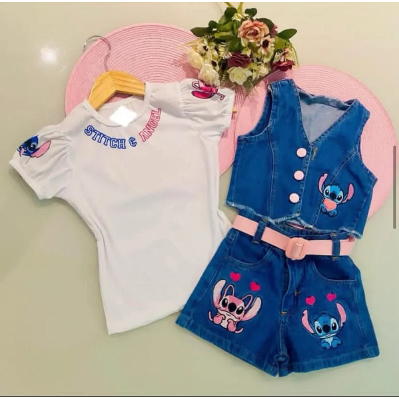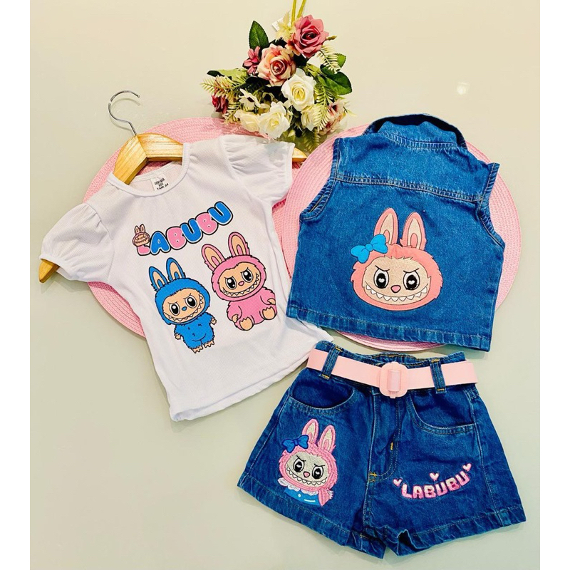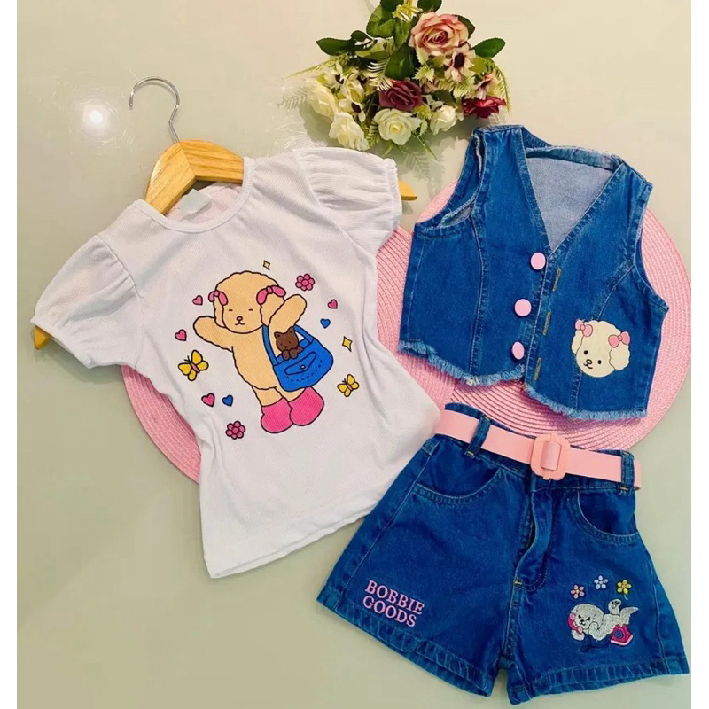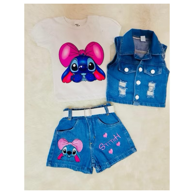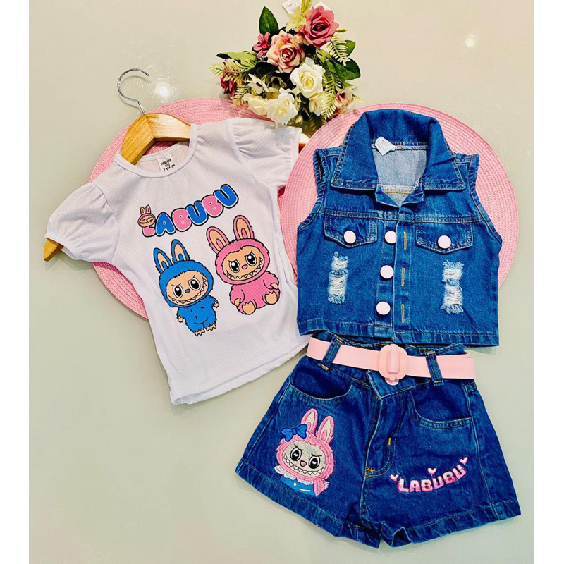 Conjunto Infantil Menina Bloguerinha Colete Jeans + Blusa + Short Jeans * Cinto