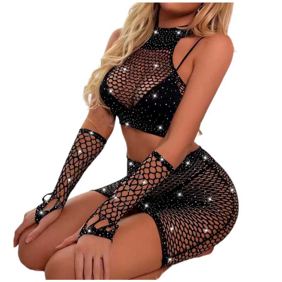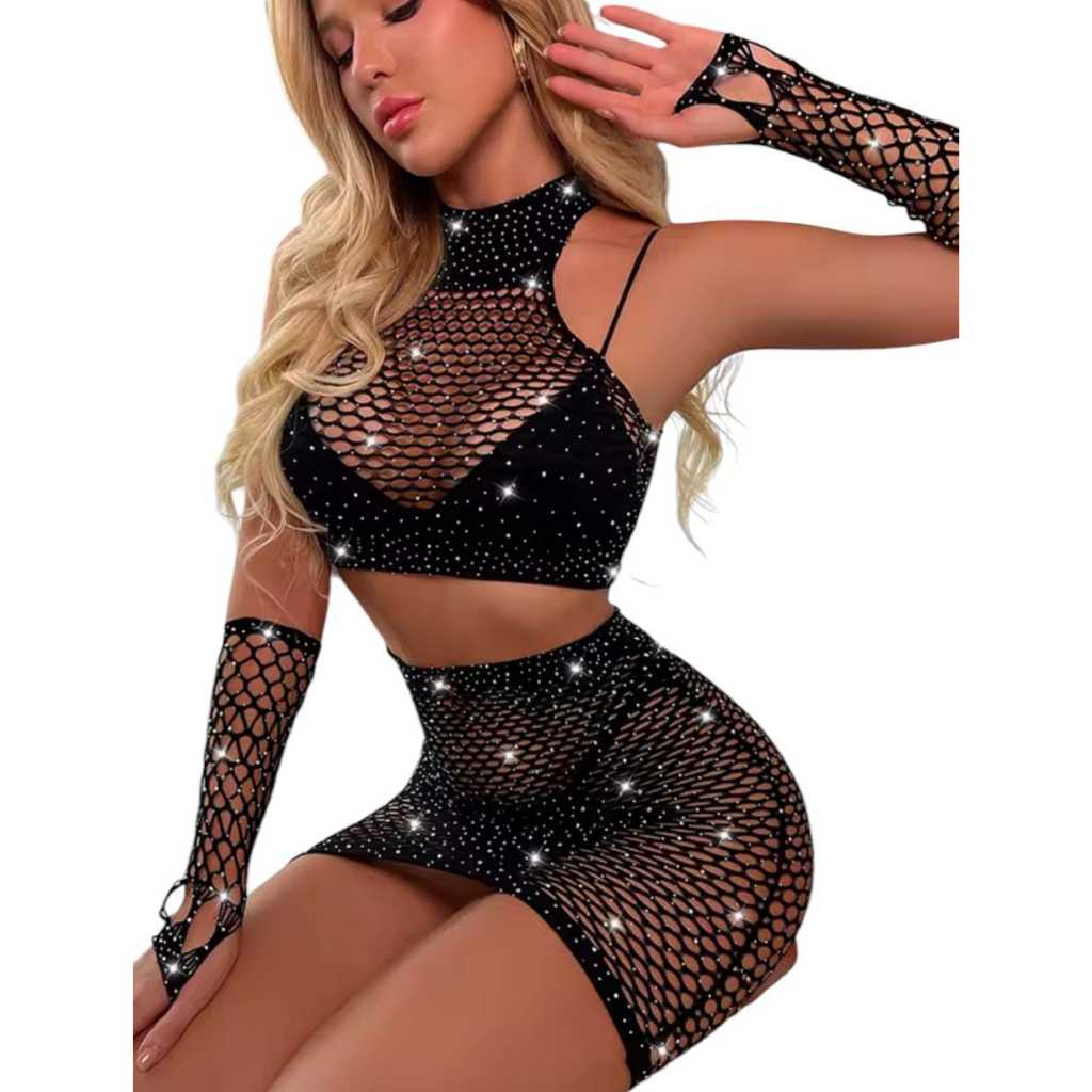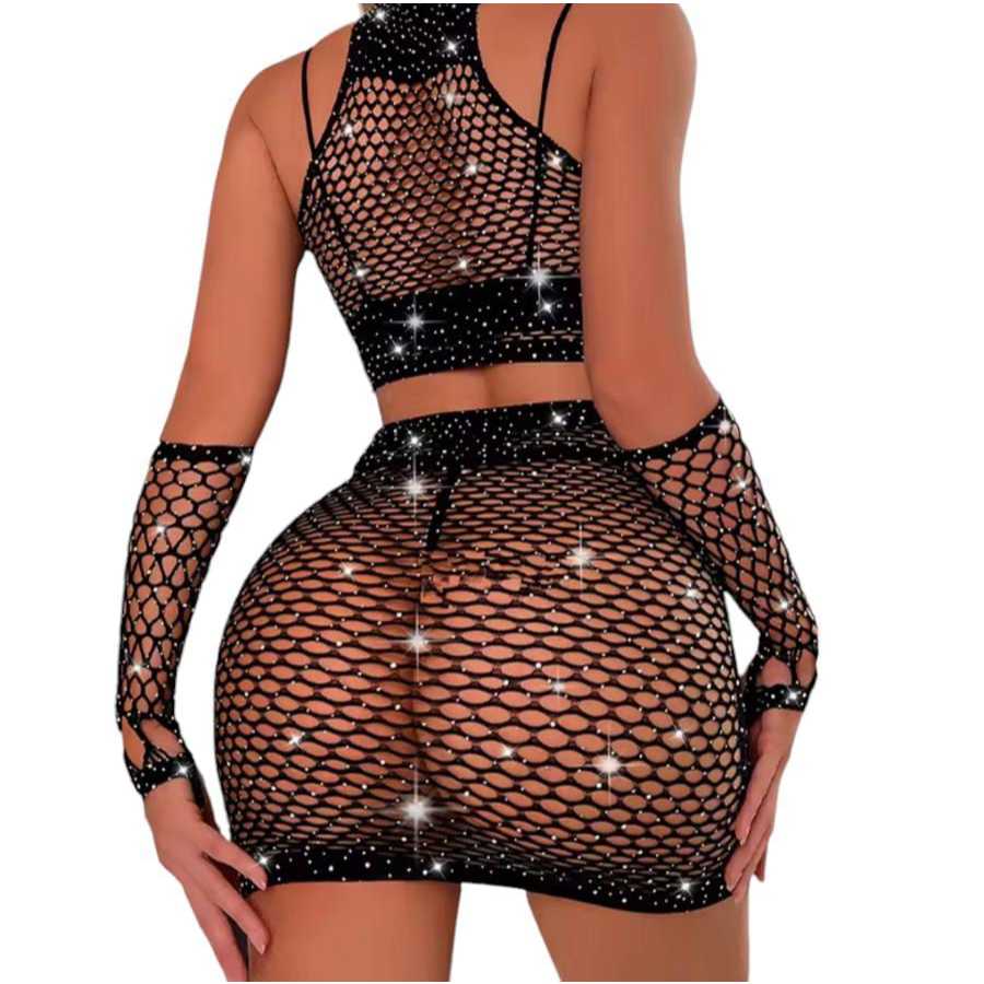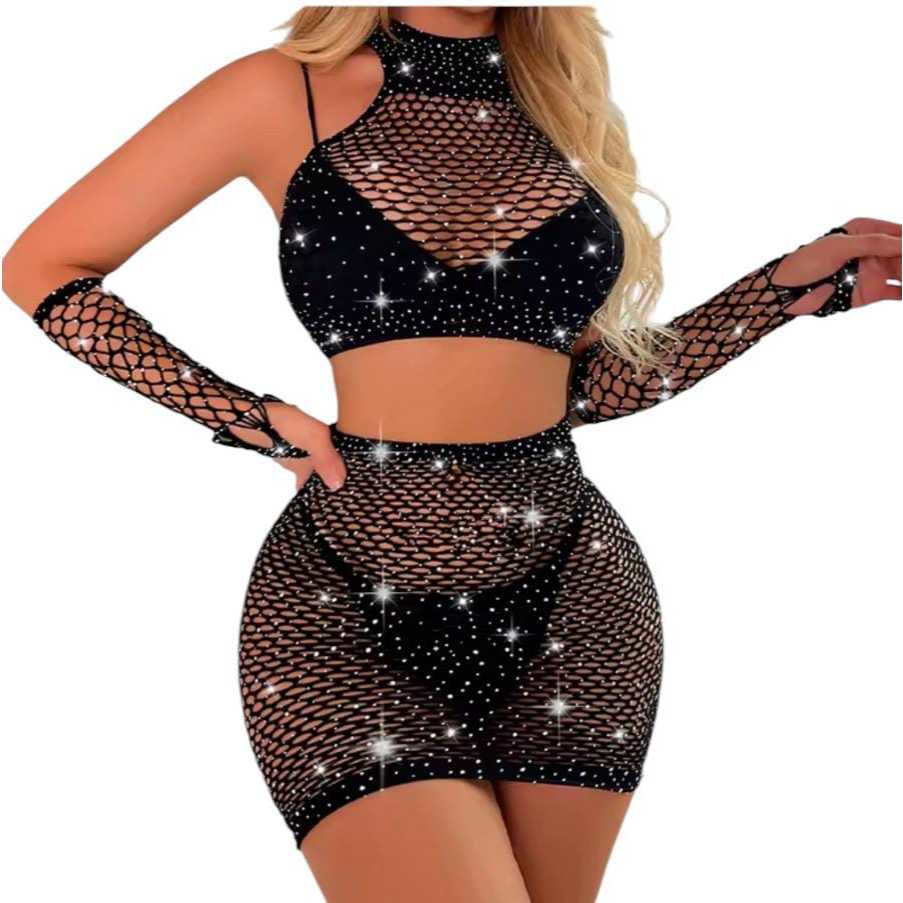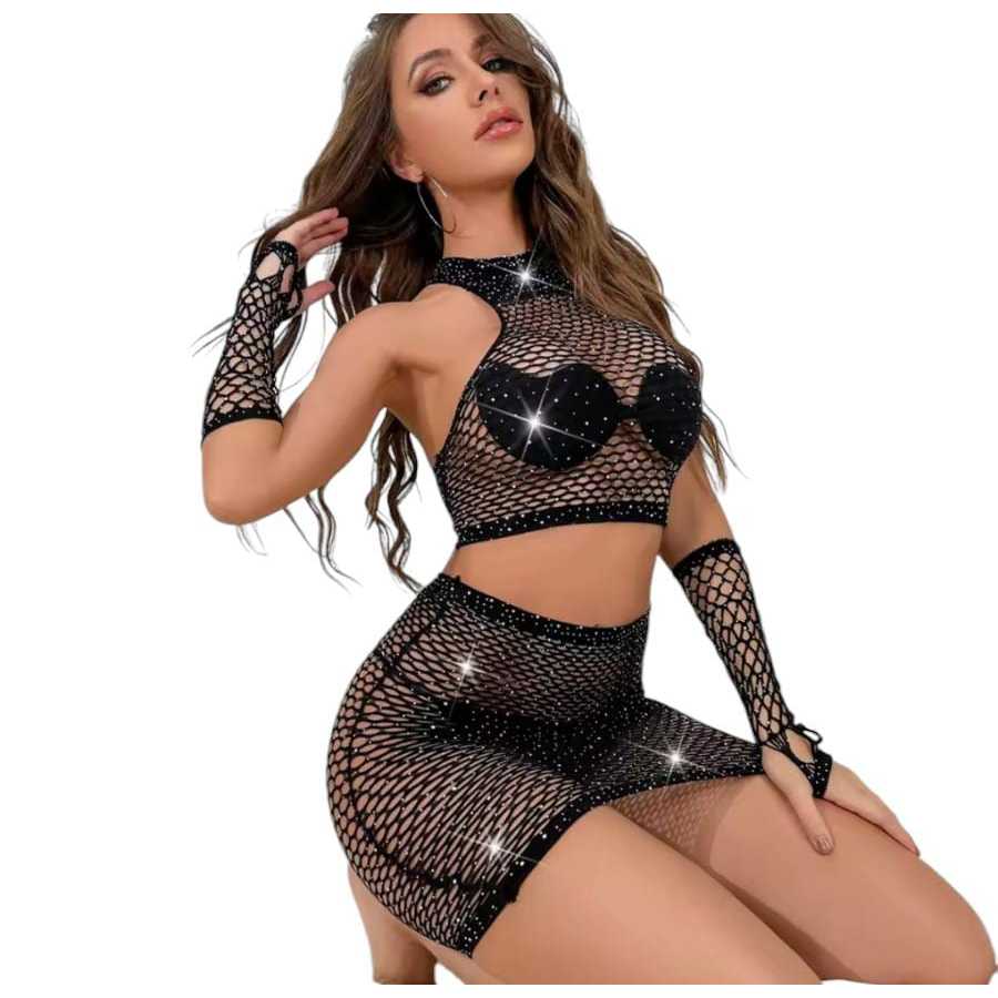 fantasia saia, top e luva arrastão vazado com stras para praia festa fantasia carnaval