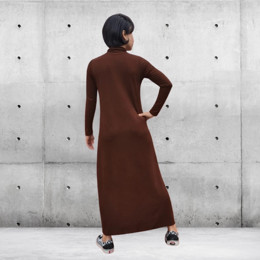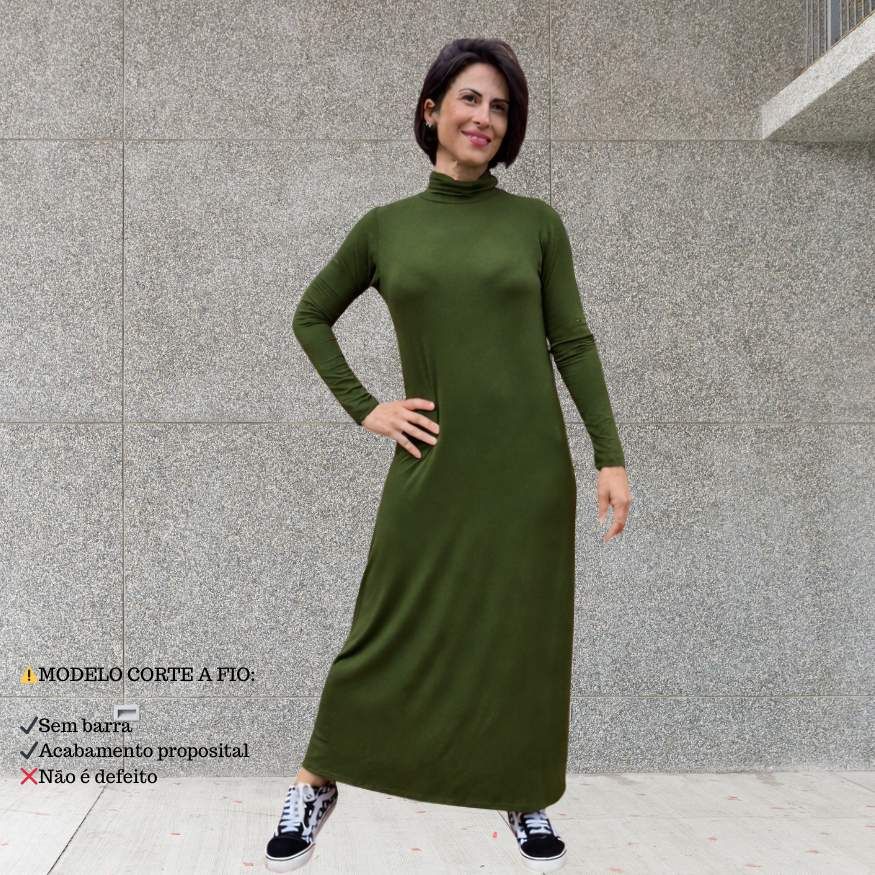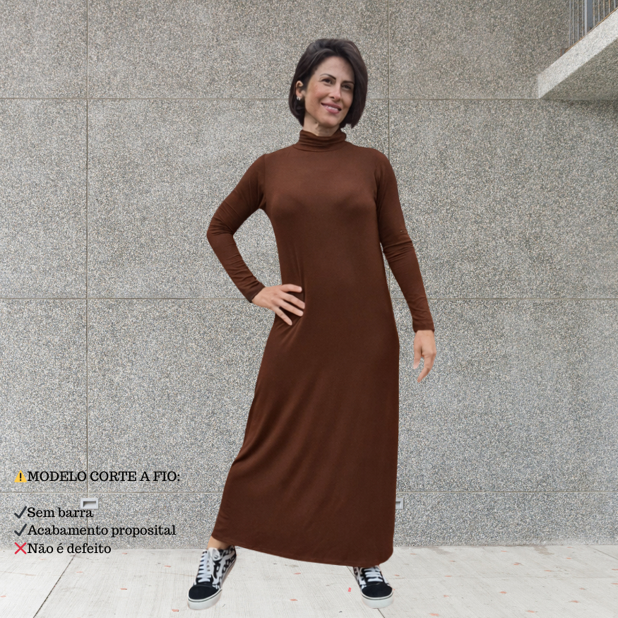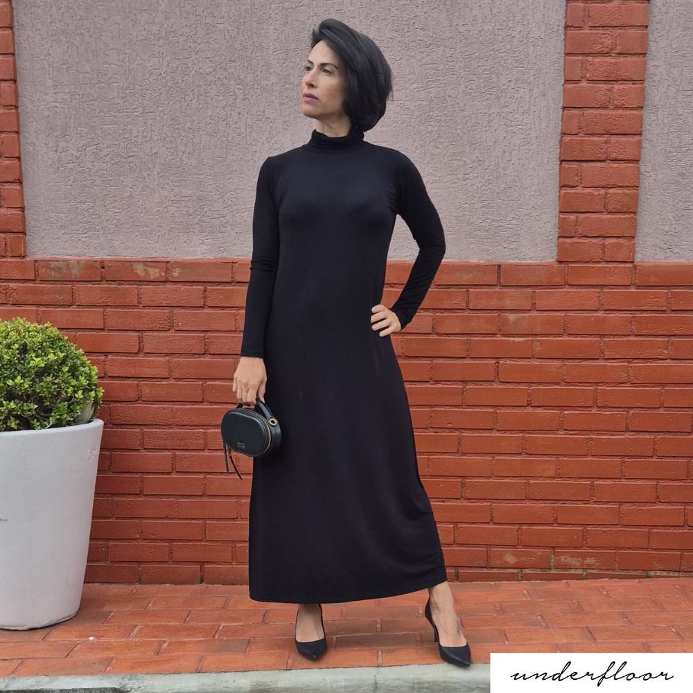 VESTIDO FEMININO PRETO MANGA LONGA MIDI LONGO GOLA ALTA BOHO OUTONO INVERNO ESTILO CASUAL ELEGANTE