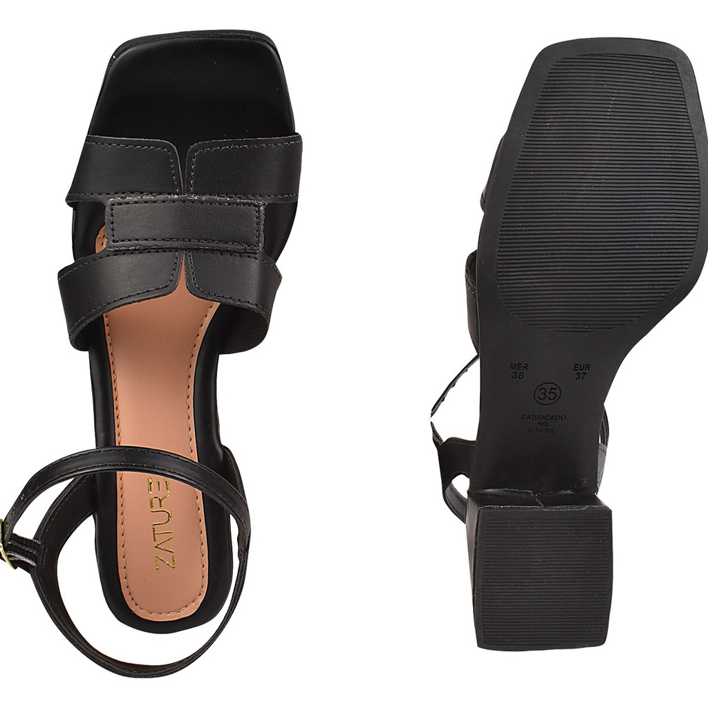 Sandália Feminina Tira em H com Fivela Salto Bloco Baixo Bico Quadrado Casual