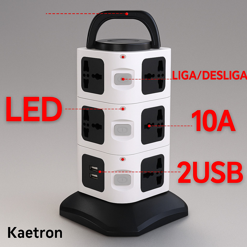 Tomada Elétrica Vertical Extensão 12 Tomadas Torre Mesa 12 Saida E 2 Usb 2500w Com botão Liga/Desliga