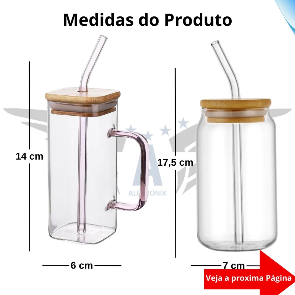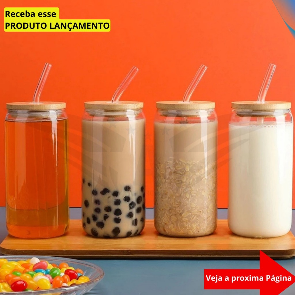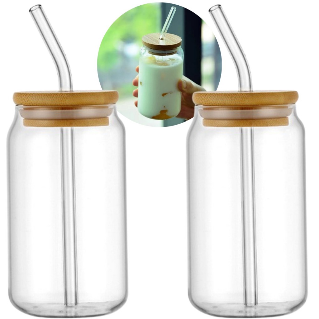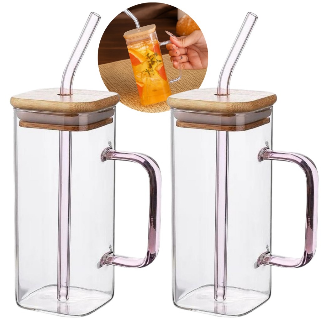 Kit 2 Canecas Vidro Tampa de Bambu Canudo Borossilicato Copo Drink Café Iced Coffee Premium 600ml 300ml