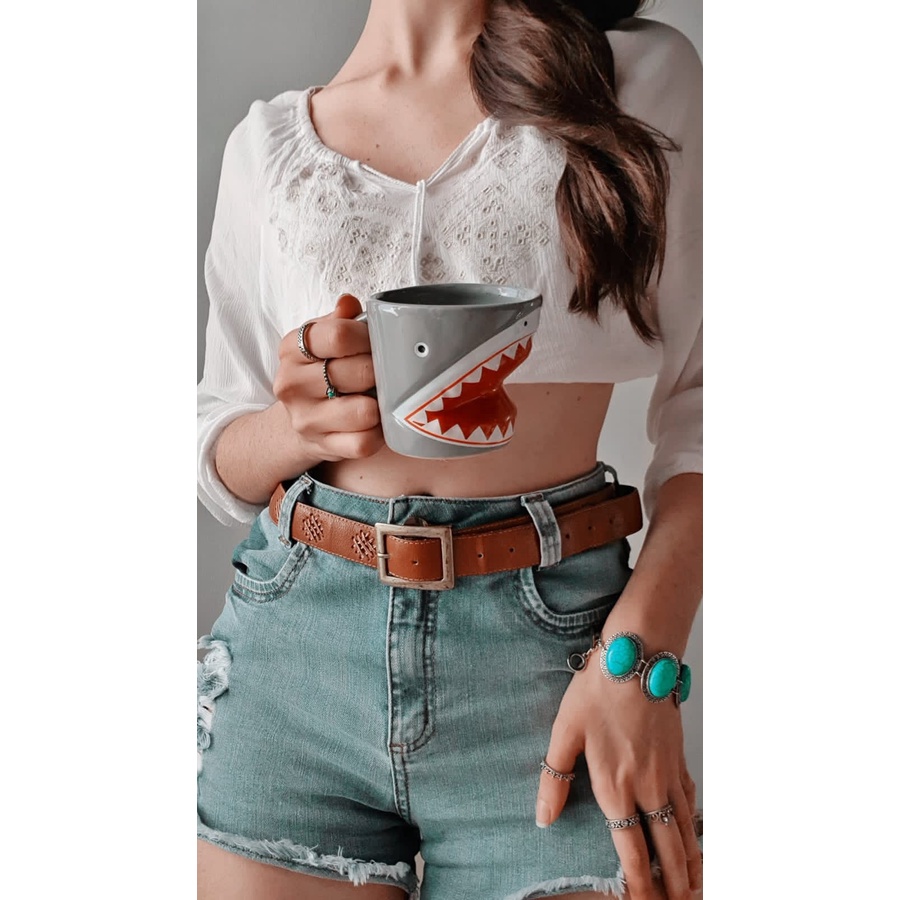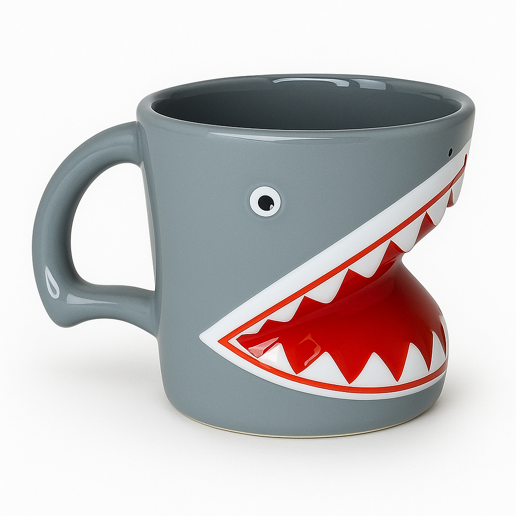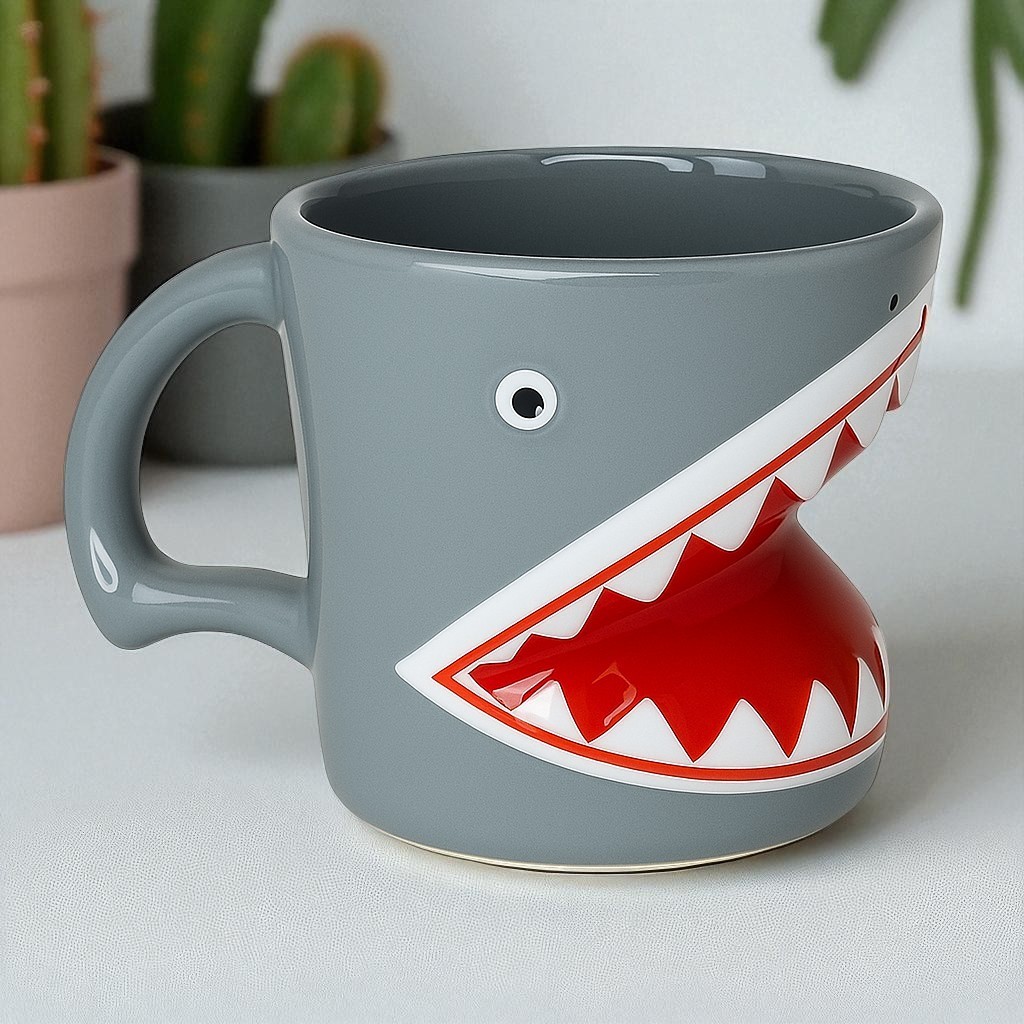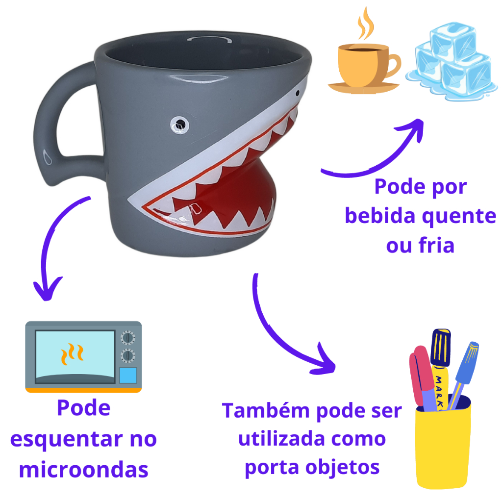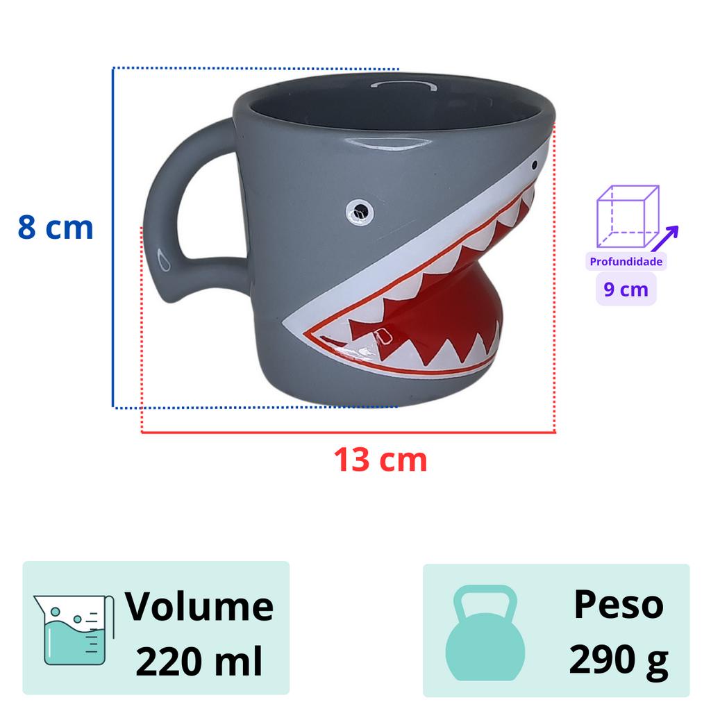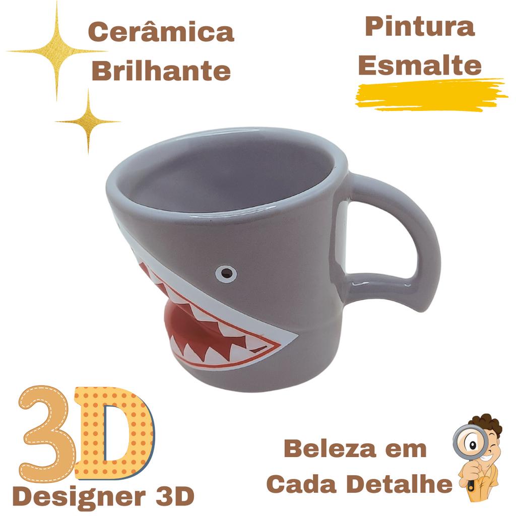 Caneca 3D Tubarão Shark Animal Peixe Cerâmica Brilhante Esmaltada Alto Relevo Temática Porta Objetos