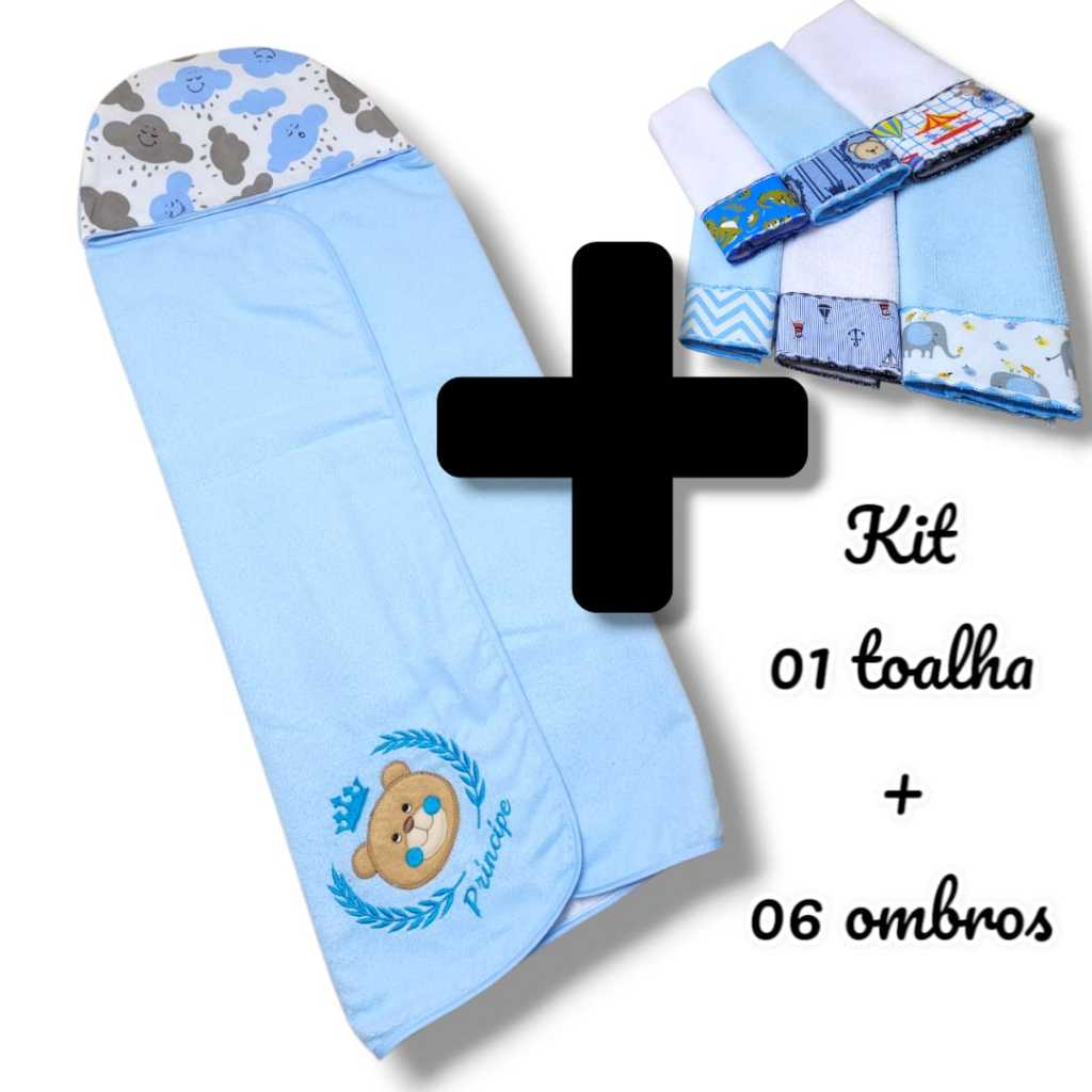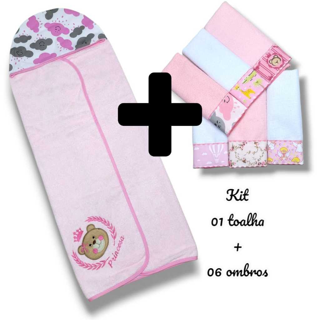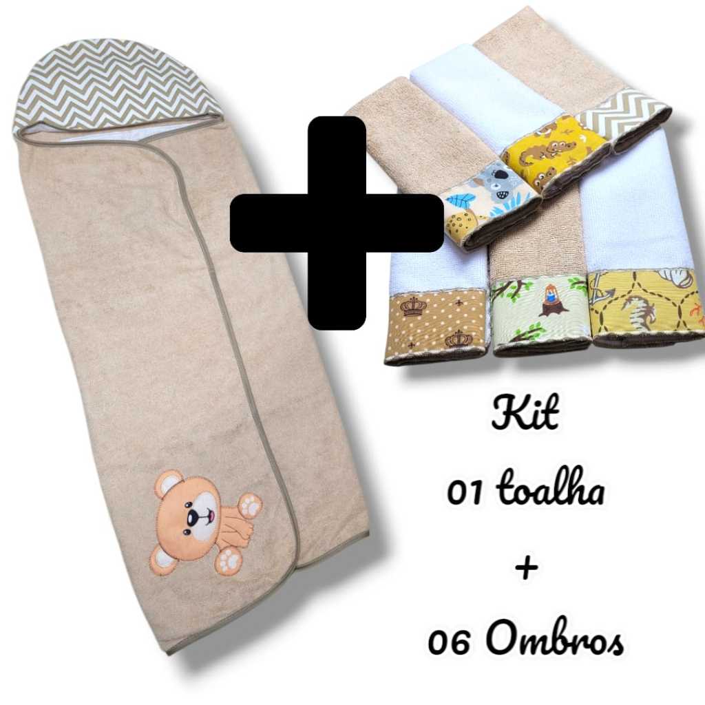 Toalha Infantil Bebê Com Capuz Forrada + Toalha Ombro Boca Tipo Babete Overlocada Tecidos Atoalhados Facil Absorção