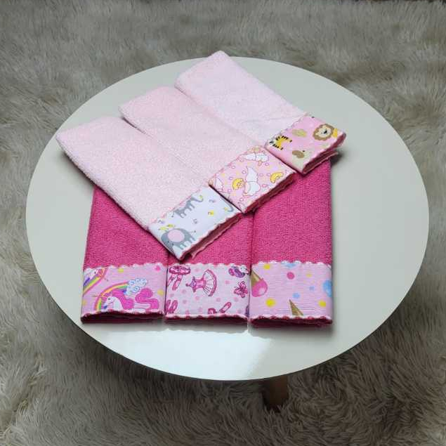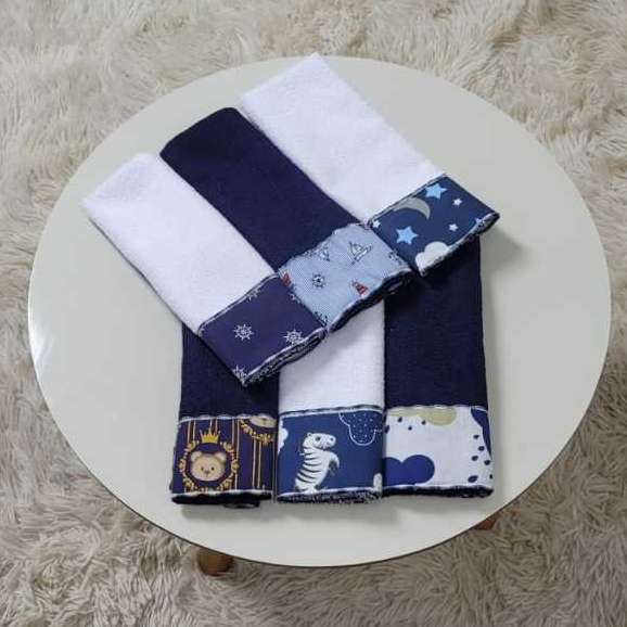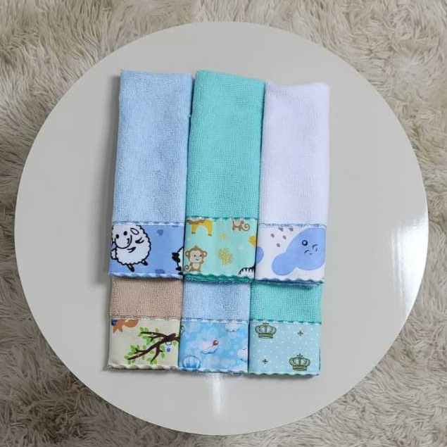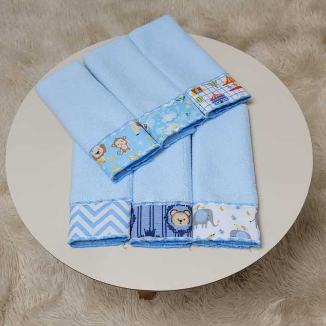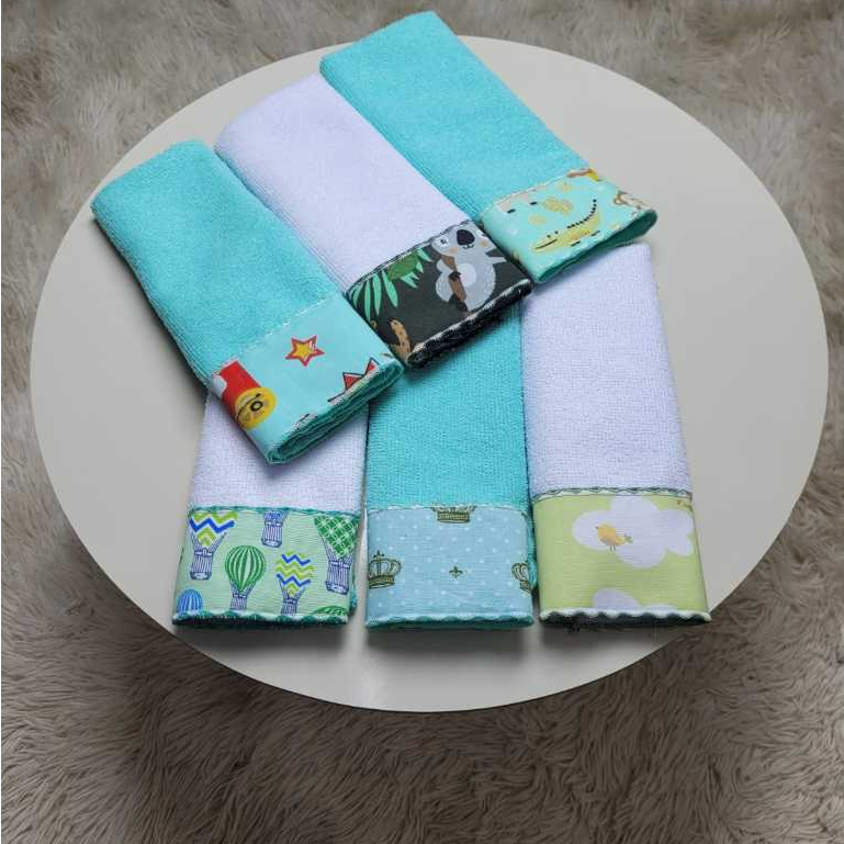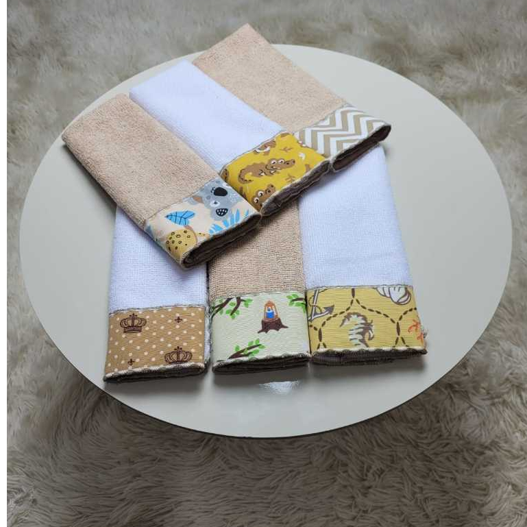 Kit 06 Un. Toalhinhas Ombro ou Boca Tipo Babete Em Algodão Overlocada E Detalhes Em Tecidos Estampados 20cm x 40cm