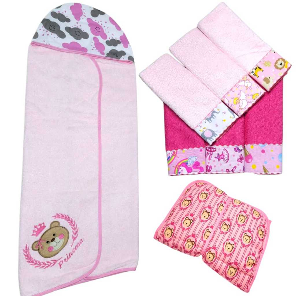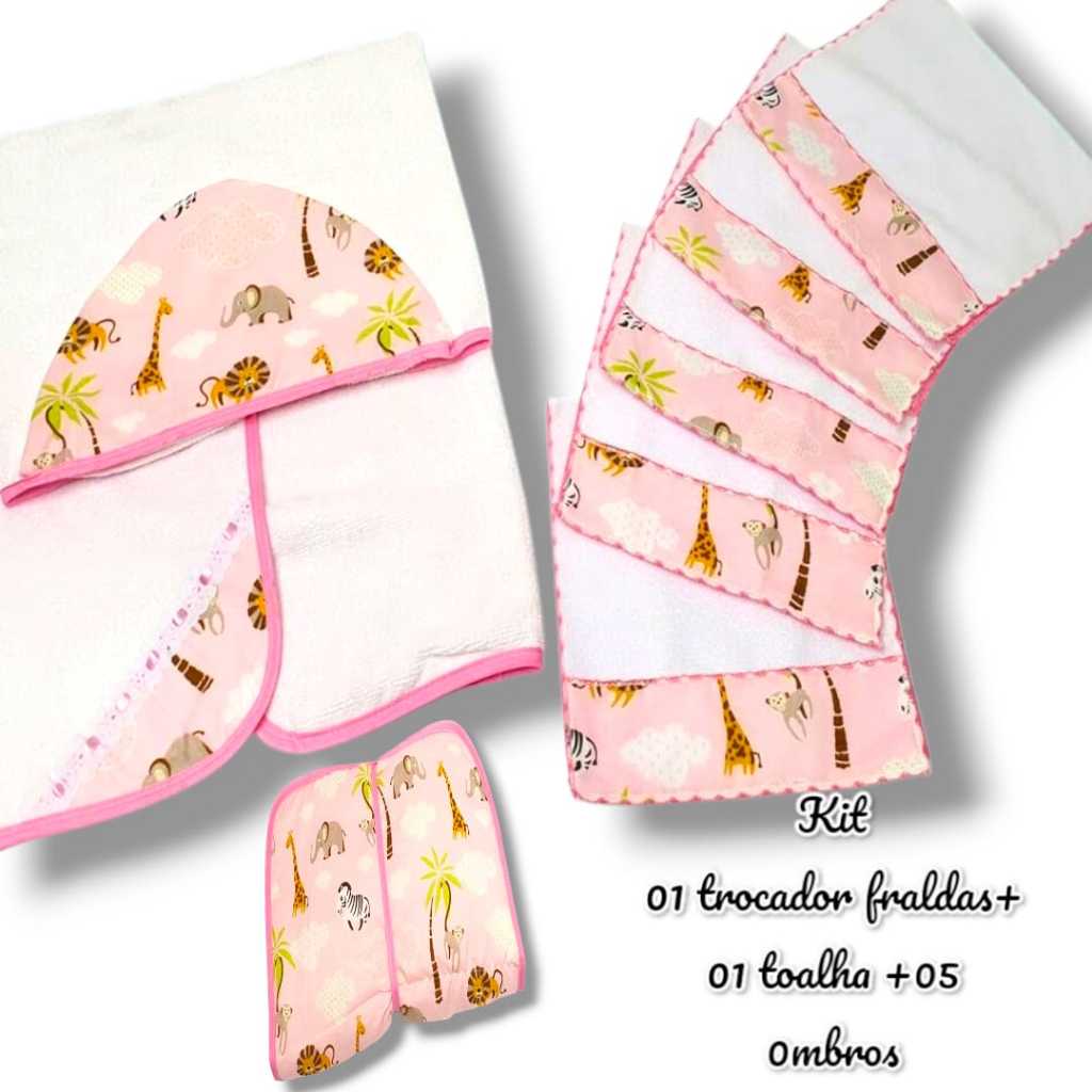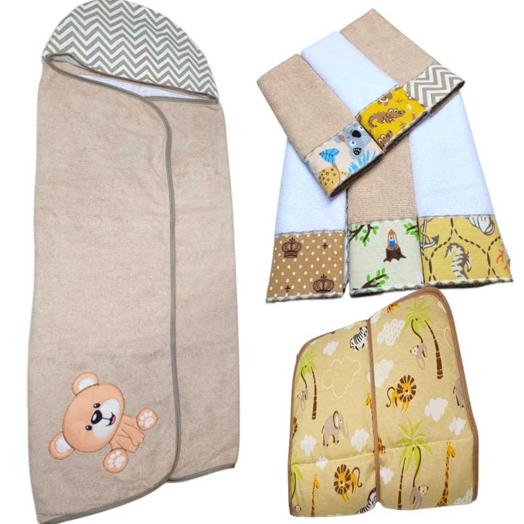 Kit Toalha Infantil Bebê Com Capuz + Trocador Infatil Impermeável + Toalha Ombro Boca Babete Tecido Atoalhado Algodão