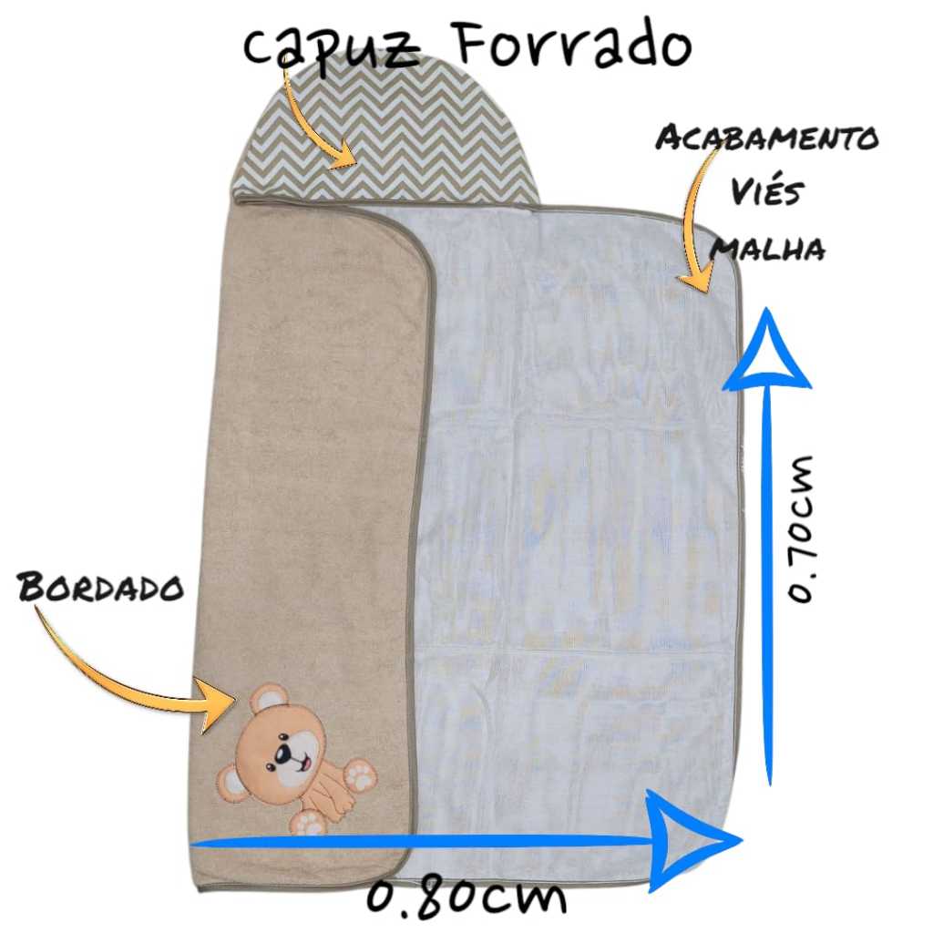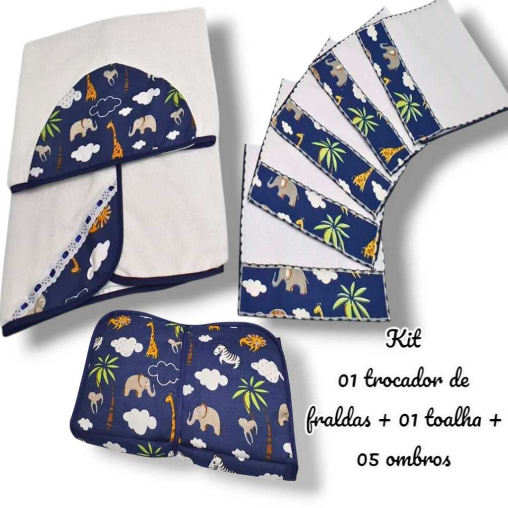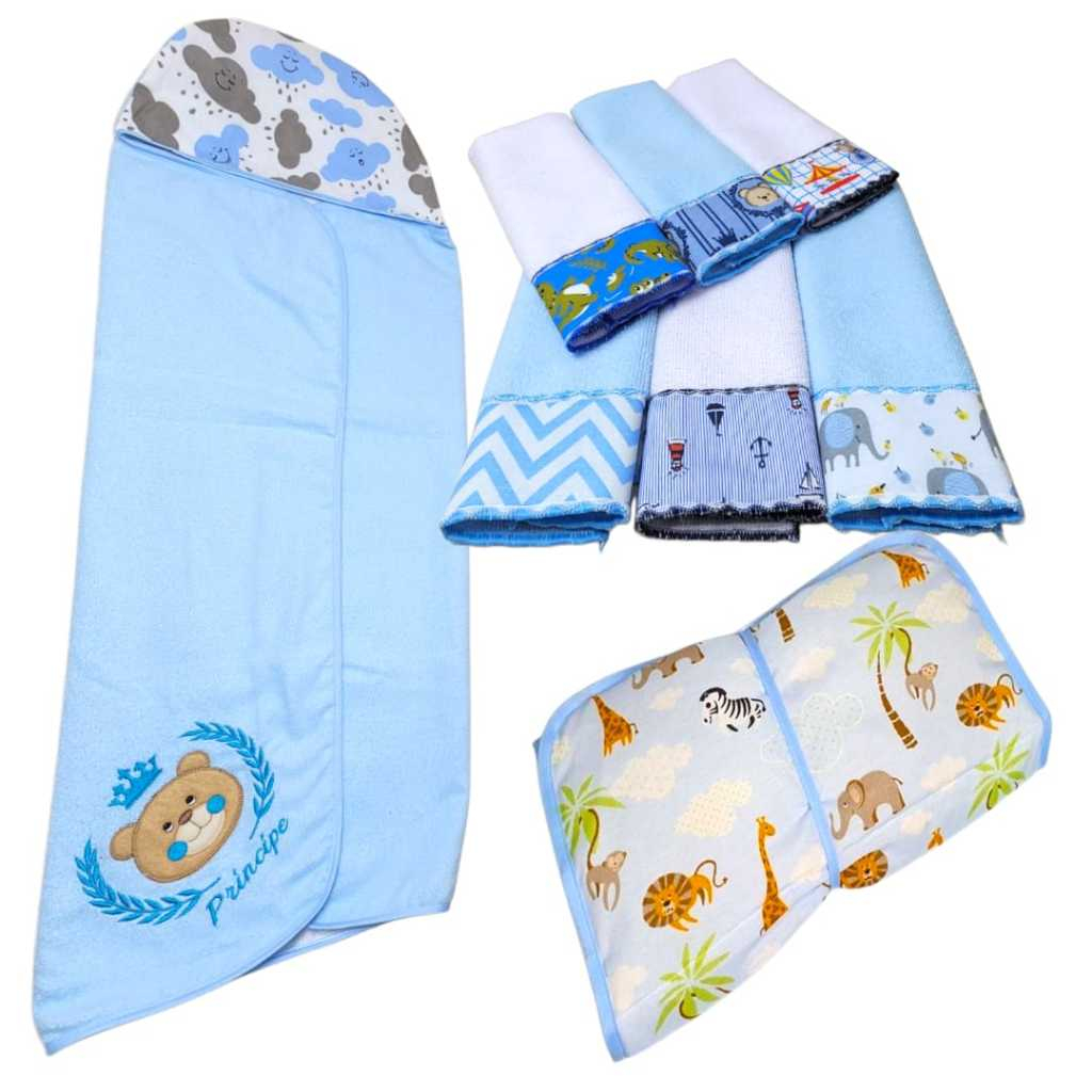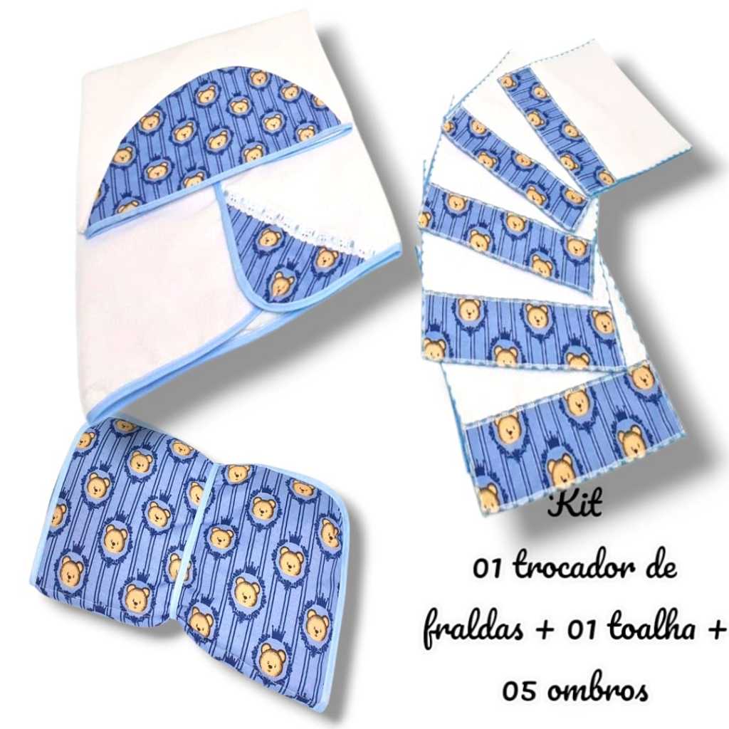 Kit Toalha Infantil Bebê Com Capuz + Trocador Infatil Impermeável + Toalha Ombro Boca Babete Tecido Atoalhado Algodão