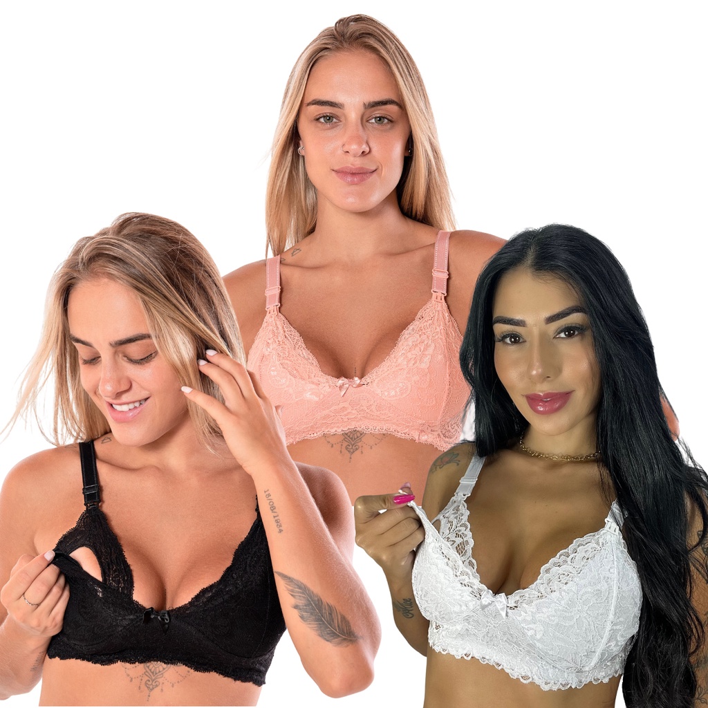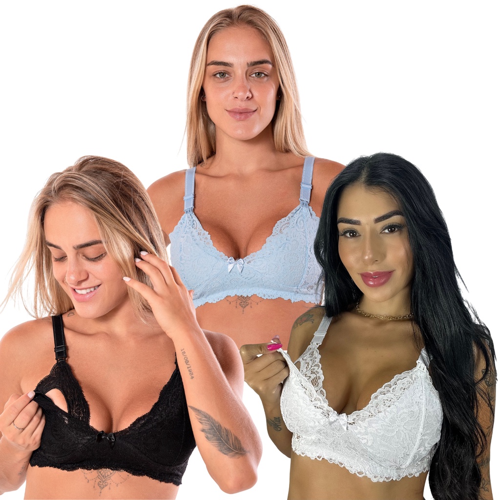 KIT 3 Sutiã de Amamentação Renda Reforçado Gestante Pós Parto