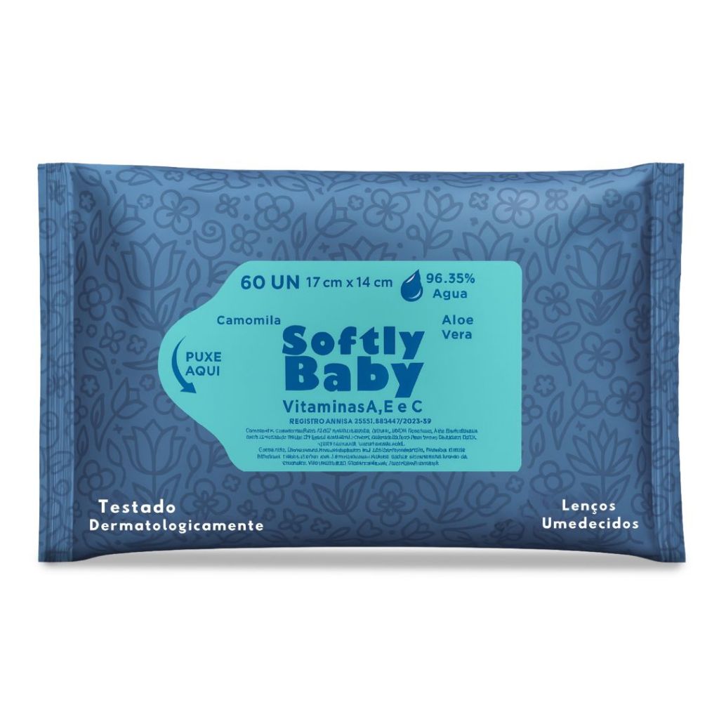 240UN Lenço Umedecido Baby Softly Vitaminas A, E e C Aloe Vera, Camomila - 4 pacotes com 60 unidades