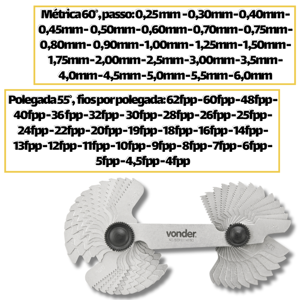 Calibre Pente para rosca Vonder Rosca 52 Laminas Precisão Baixo Relevo Forte - Medidor De Passo 0,25 A 6,0mm Pole Vonder
