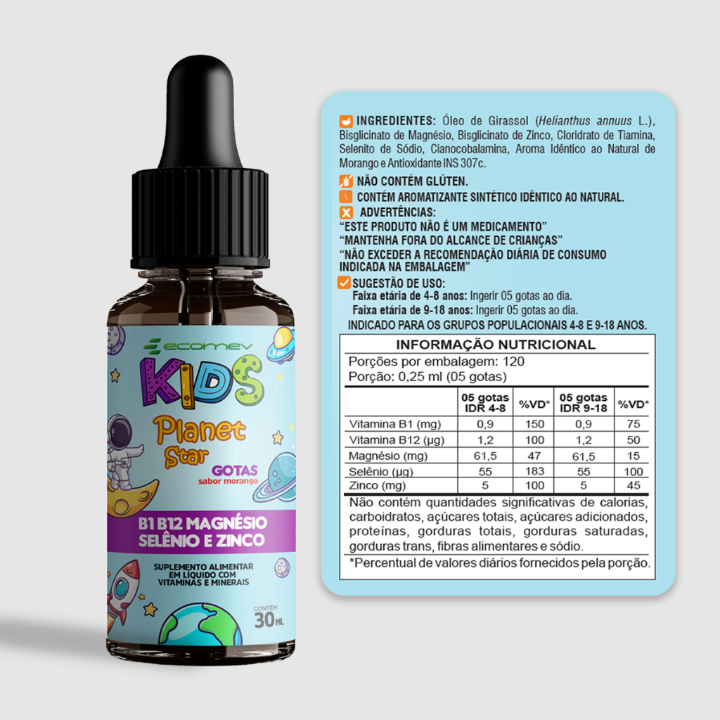 Foco Kids Magnesio B1 B12 Selenio Zinco Vitamina Infantil Gotas Morango 30ml Ecomev