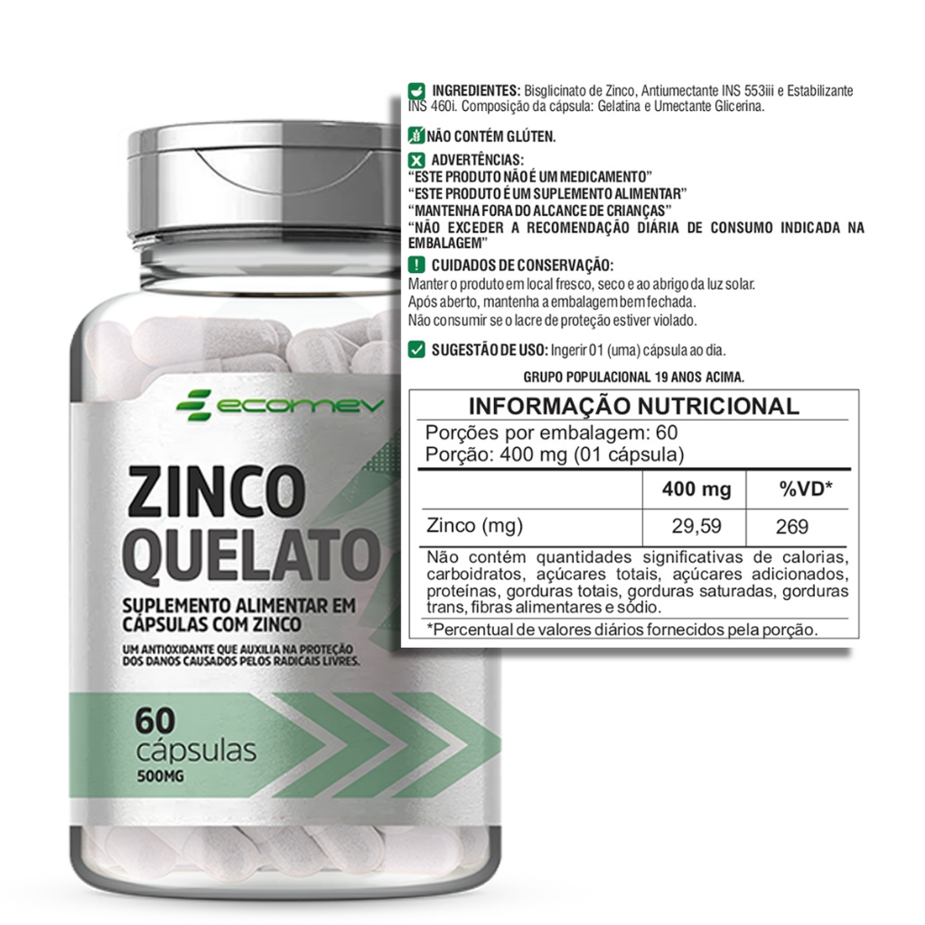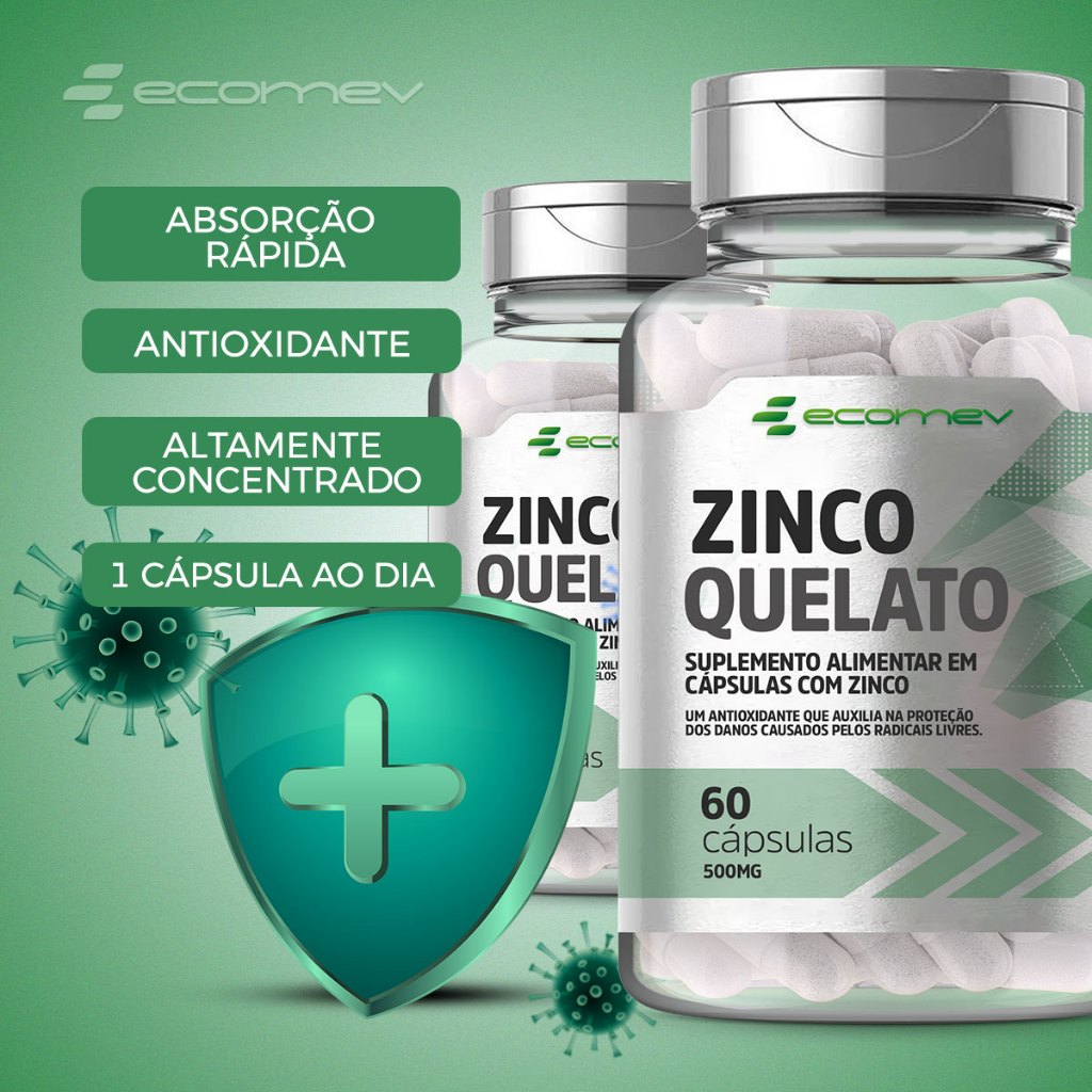 Zinco Quelato 400mg Dose Máxima Puro Concentrado 60Cáps 2 Meses de Uso Ecomev