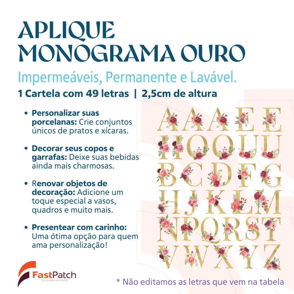 Aplique Monograma Alfabeto Patch Verniz Personalização 2,5cm altura para xicaras garrafas cadernos