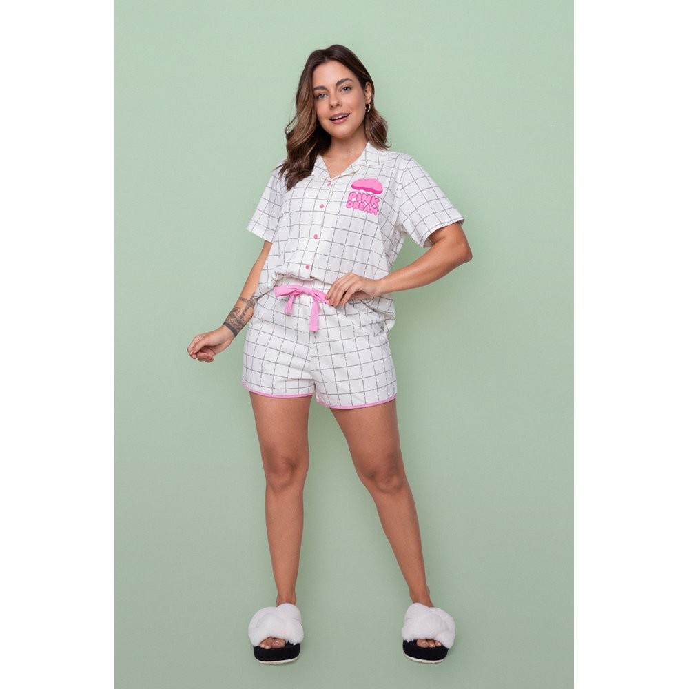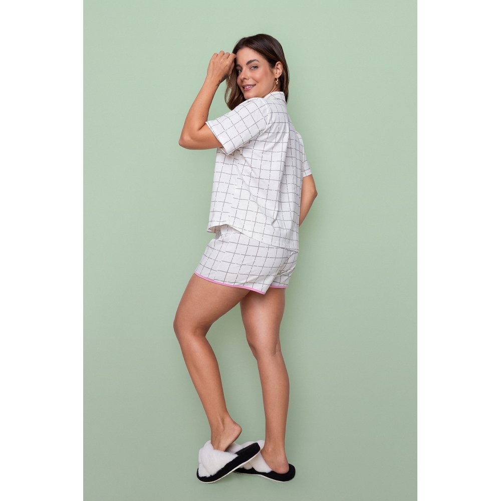 Pijama Americano Blogueirinha Algodão Manga Curta Botões Abertura Xadrez Off