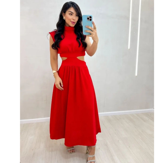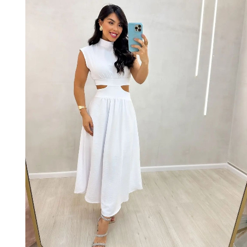 Vestido longo Midi Acinturado com Recorte Vazado e Bolsos Práticos Fechamento em Zíper Roupa Feminina Premium duna