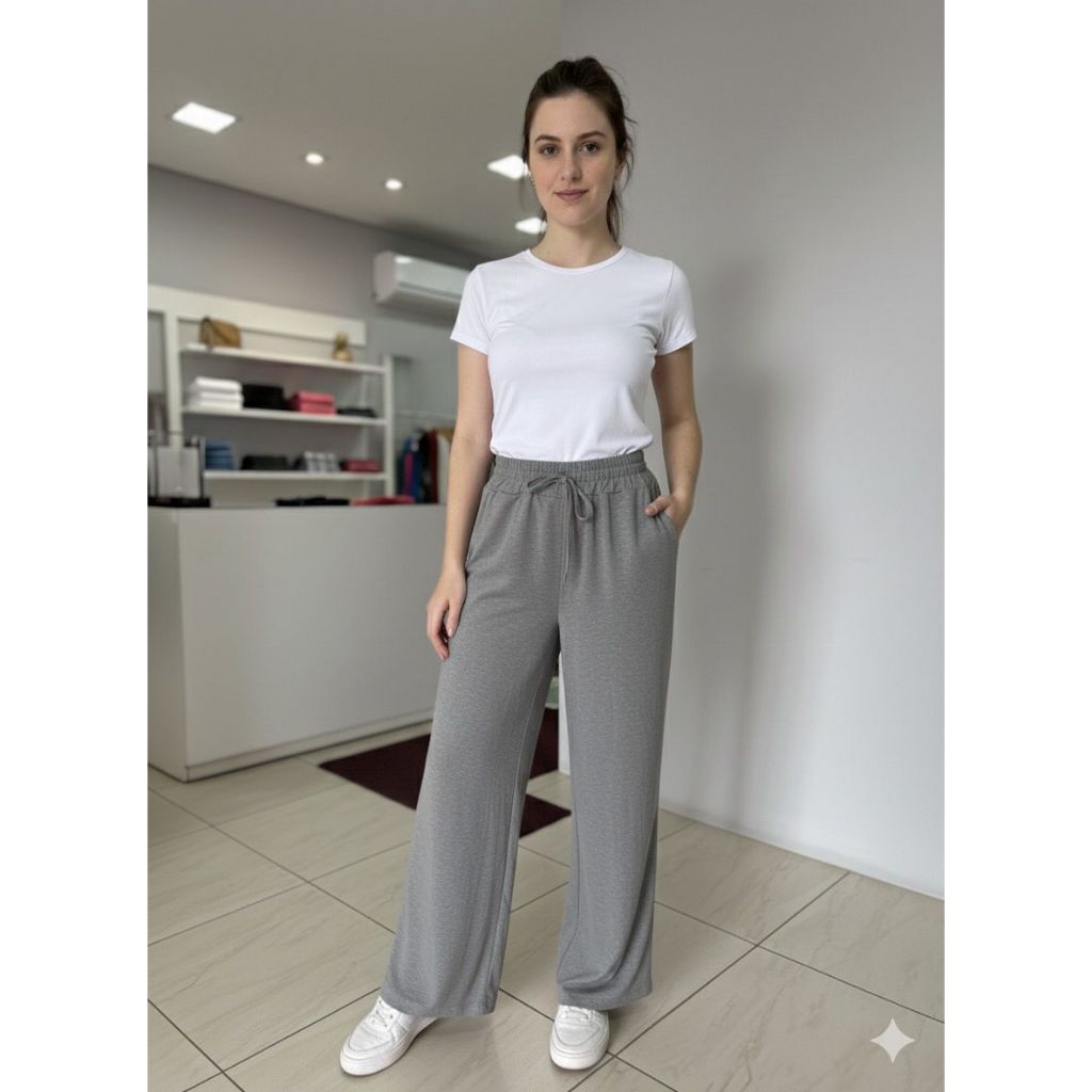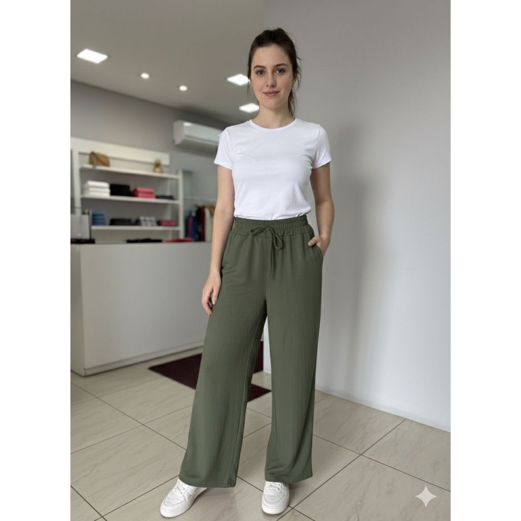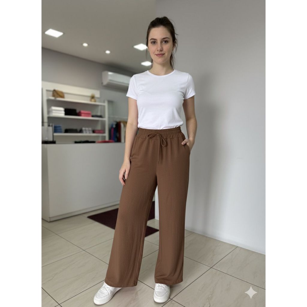 Calça Pantalona Feminina Com Bolso Cintura Alta com Elástico na Cintura
