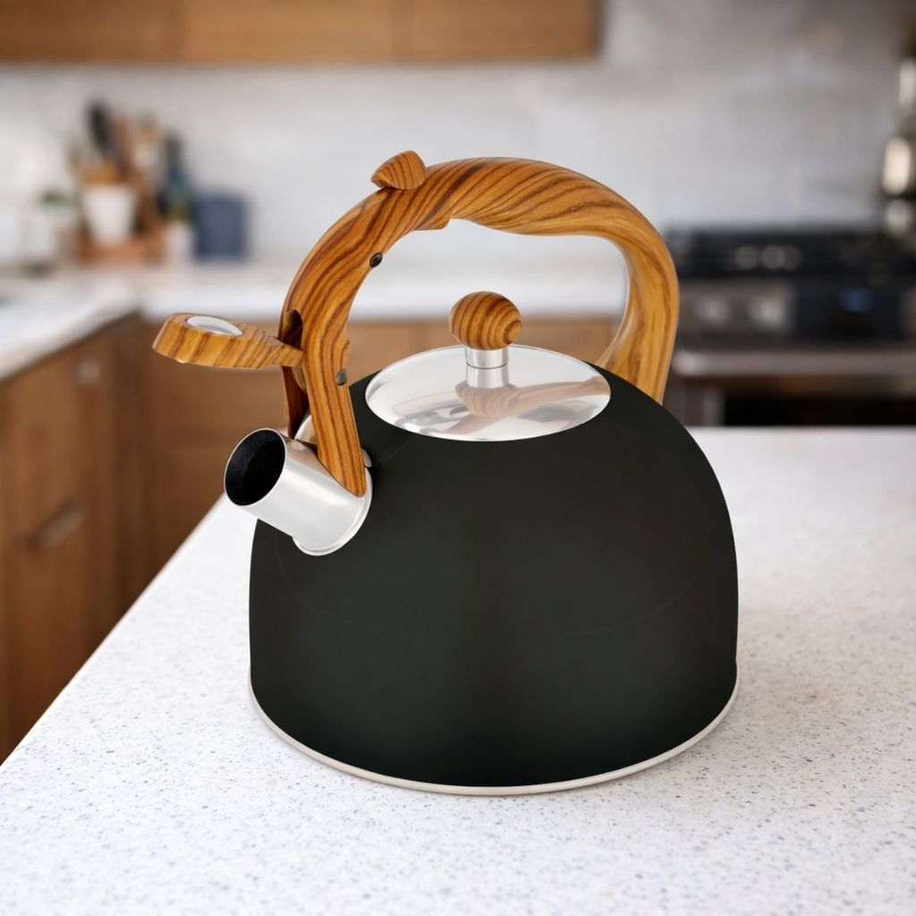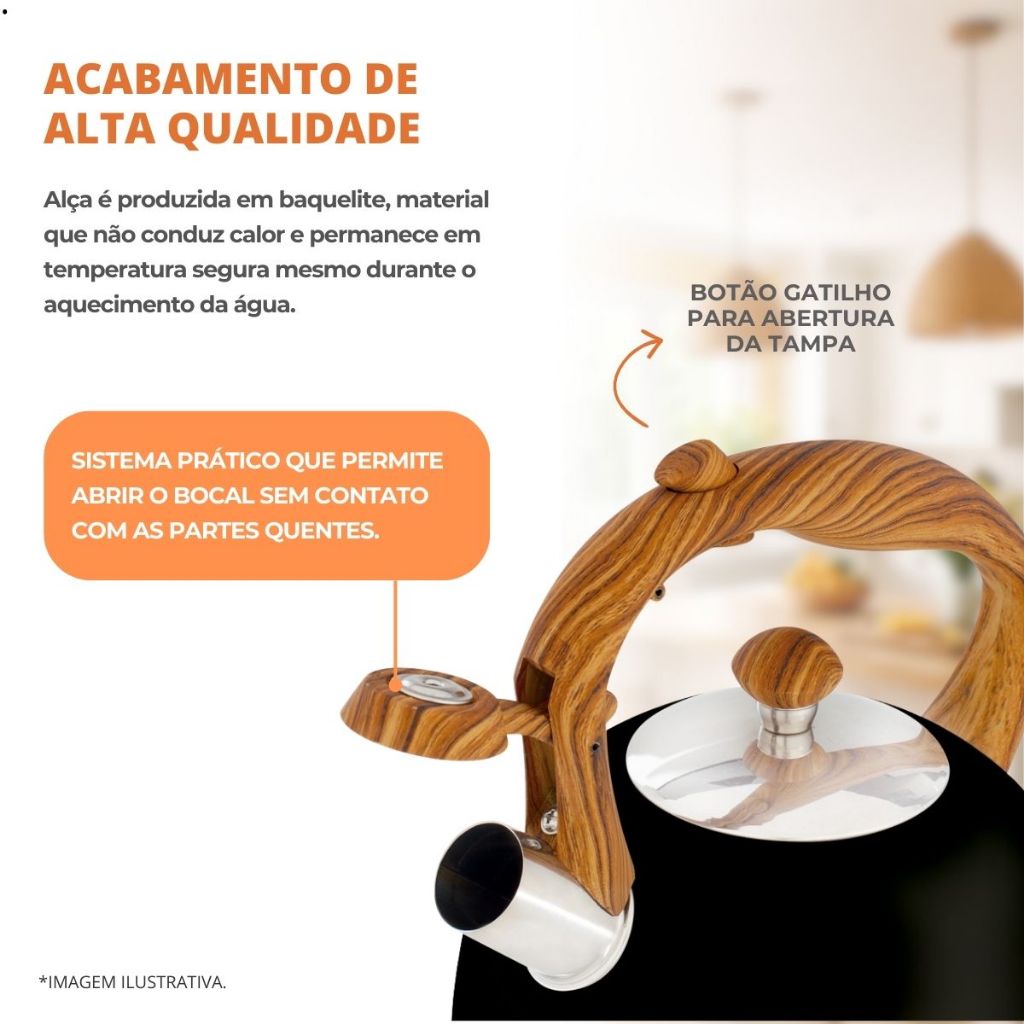 Chaleira Mor Wood 2,5L com Apito – Inox – Cabo Imitando Madeira – Cores Preto ou Bege