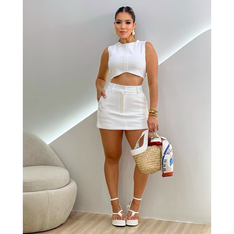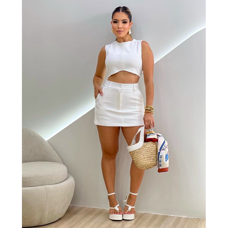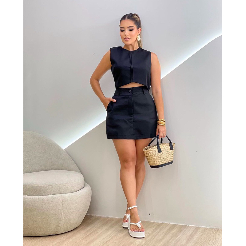 Conjunto Crepe de Alfaiataria com Short Saia e Croped Zíper