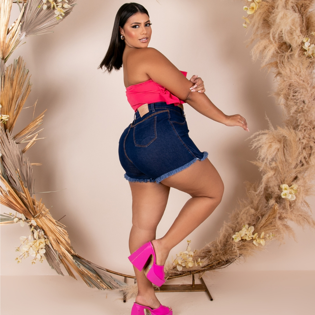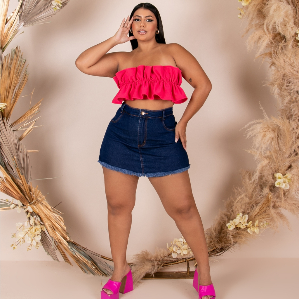 Short Saia Plus Size Jeans Cintura Alta Barra Desfiada Com Lycra