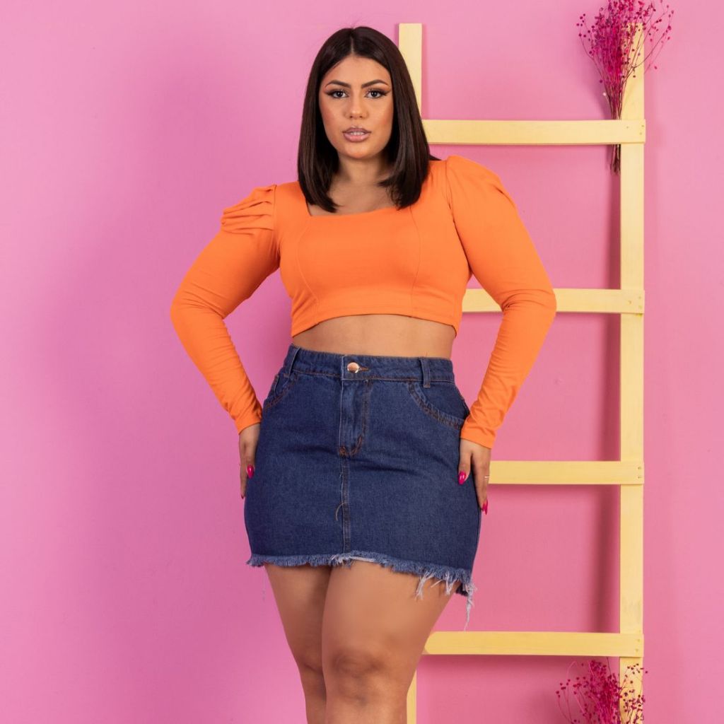 Saia Jeans Preta Plus Size Barra Desfiada Cintura Alta