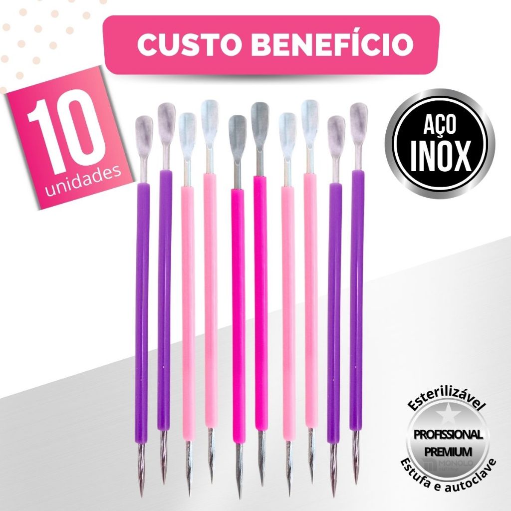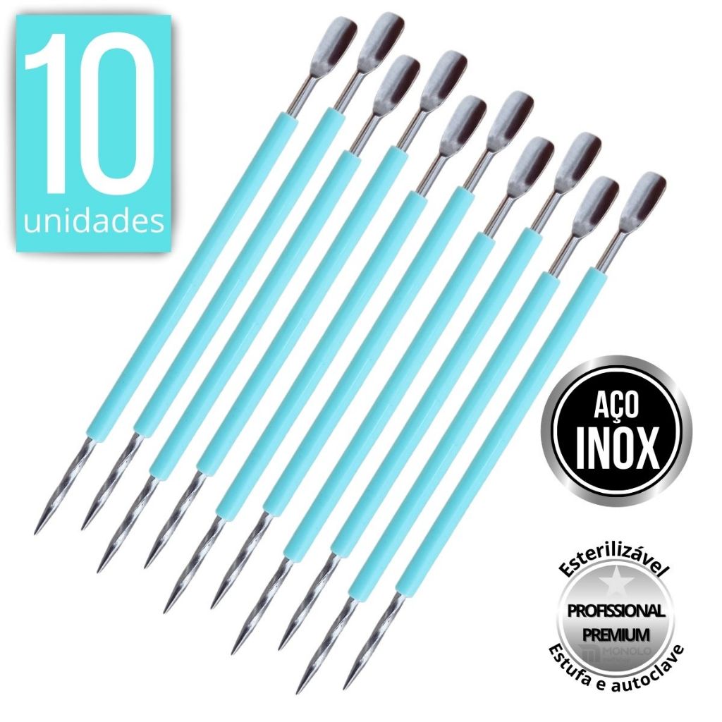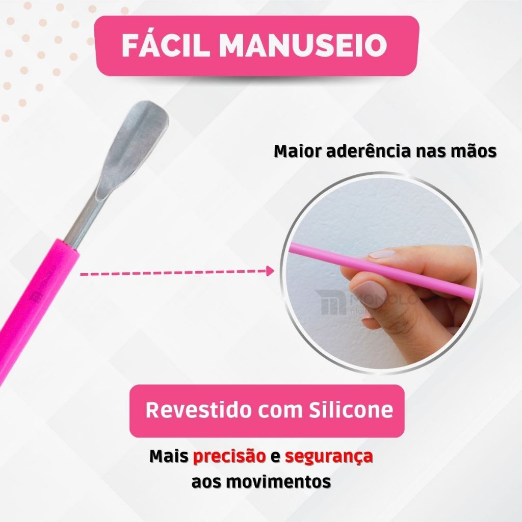 Kit 10 Espátula c/ Palito Bastão Mista Silicone Cutelaria Empurrador Curvo Unha Aço Inox Monolo