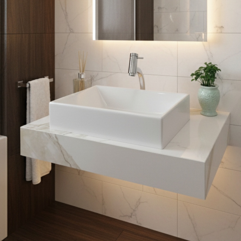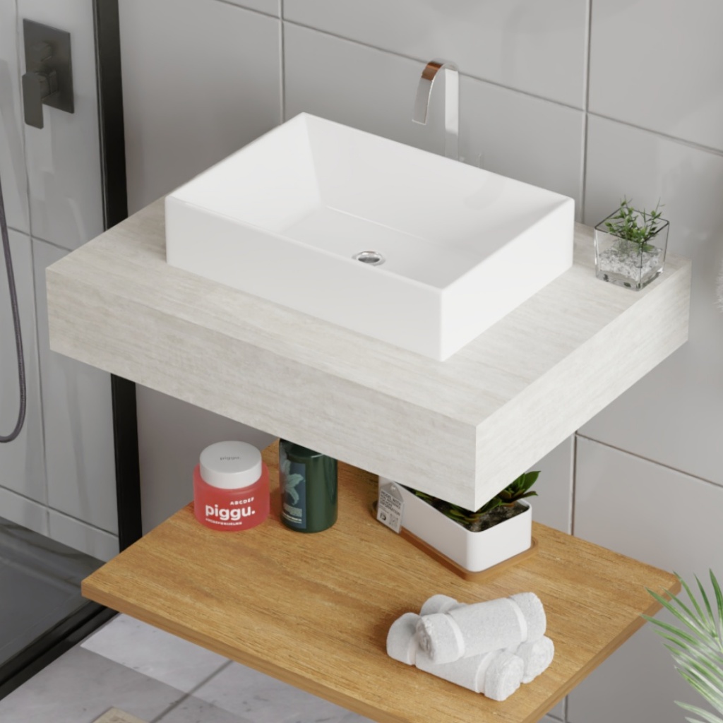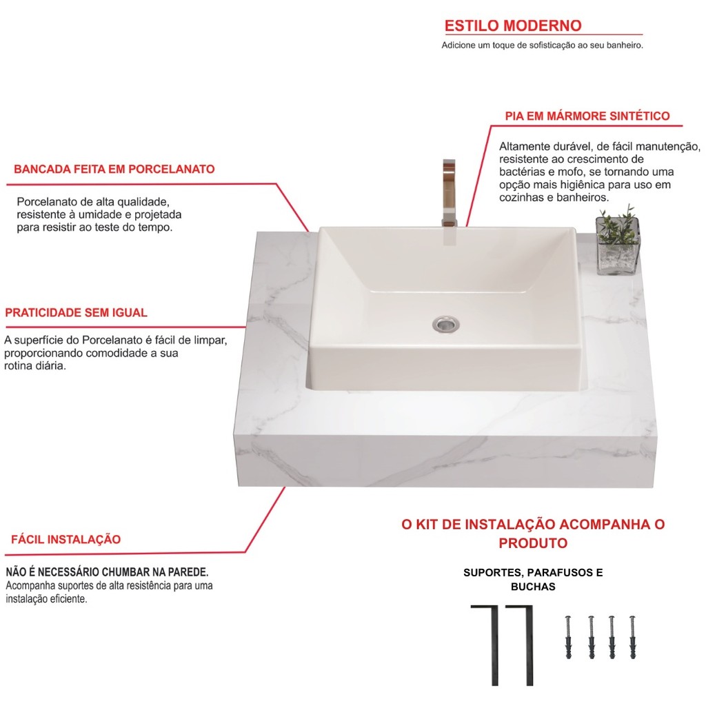 Bancada de Porcelanato Com Cuba de Apoio e Kit de Instalação Elite 62x40 Calacata Cuba Branca Mellstone